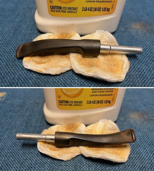 Once the stem was reasonably clean, I soaked it overnight in some Briarville Stem Oxidation Remover. This solution works to draw oxidation in the stem to the surface of the vulcanite. This is a major aid and an important step in ensuring a clean stem. The following day, I drew out the stem from its bath and scrubbed the lingering fluid with a toothbrush.