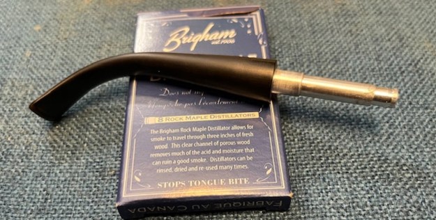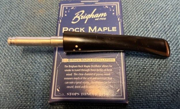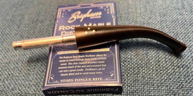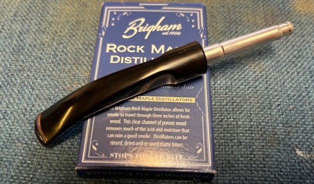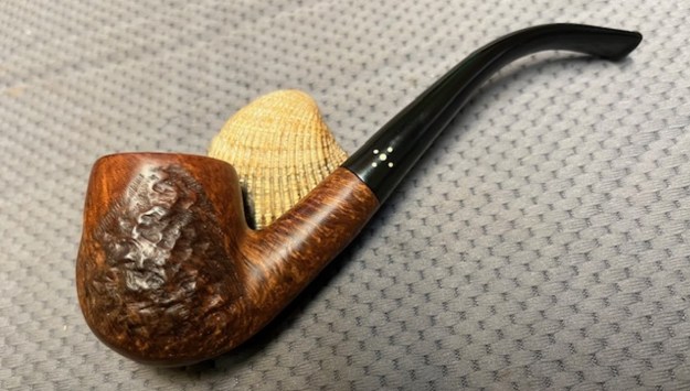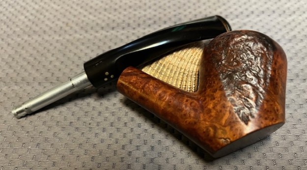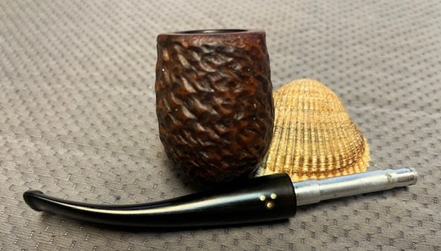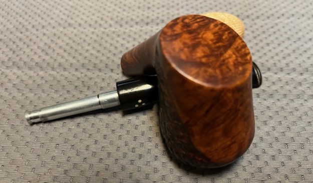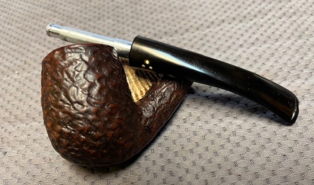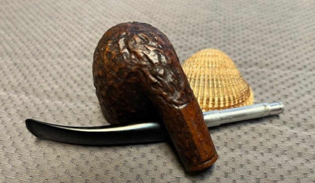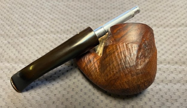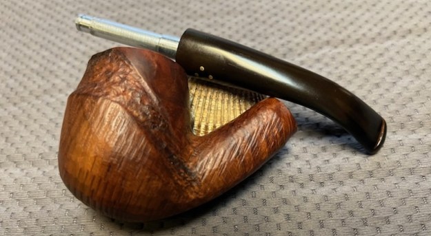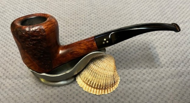 What a charming pipe this is! I got it in auction with a few other pipes, and I liked the shape of it immediately. This is a Brigham 3-dot scoop, with a handsome and rugged rustication. It really feels good in the hand. It has that look – no one could mistake it for anything but a Brigham. The tenon (which holds the maple distillator) on this pipe is made of aluminum – so it’s an older one. Curiously, it doesn’t have any shape number marked on it, nor is it listed in the book on Brigham pipes.