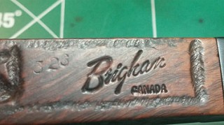 The Brigham Country of Manufacture (COM) stamp was modernized in about 1970 to consist of an upwardly-slanted Brigham logo over “Made in Canada” in small block letters. This stamp was used until approximately 1980.