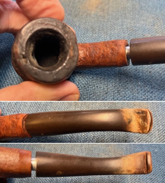 This is a beautiful pipe, but it did have some issues. The stem, however, was in good shape. Very dirty, to be sure, but not damaged. The stummel looks great – a bit dirty, some cake in the bowl and quite a bit of lava on the rim. I didn’t know it yet, but the lava hid some damage to the rim. This would be revealed later.