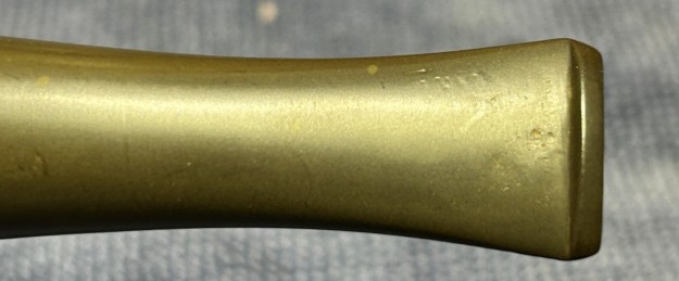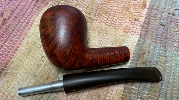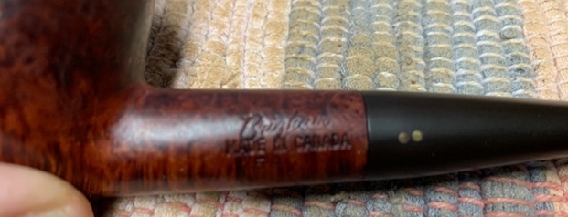Let’s examine what marks it does have. On the underside of the stummel, we read Brigham [over] Made in Canada. Of course, how those words are marked is what matters in dating Brigham pipes. I’ll get back to that. To the left of the aforementioned markings is the solitary digit 3. I can only assume that this refers to the three brass pins found on the stem.