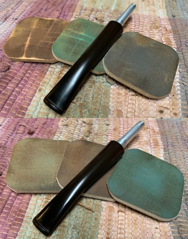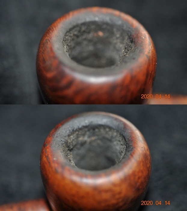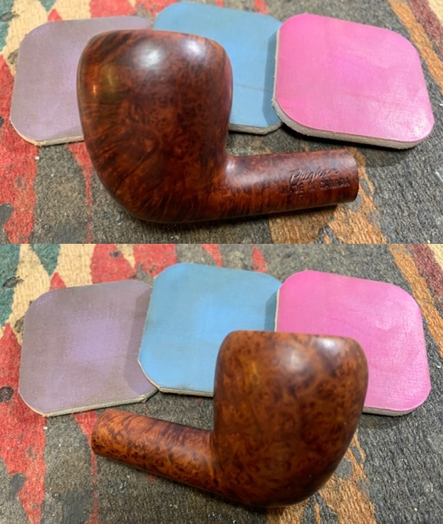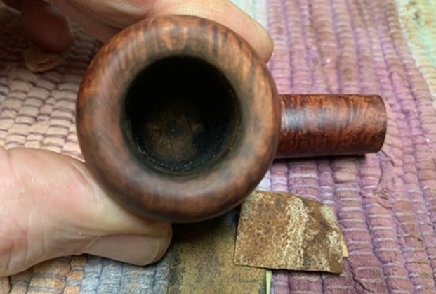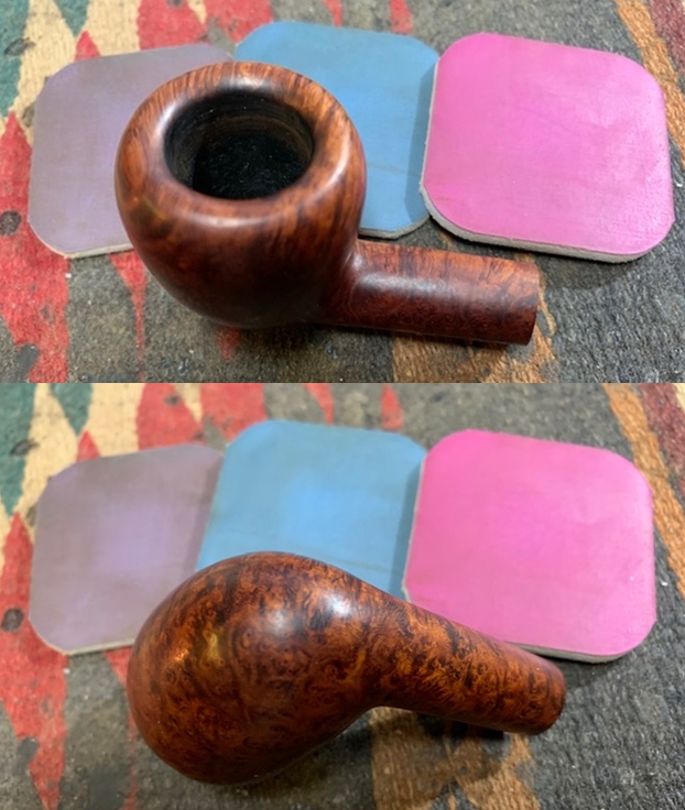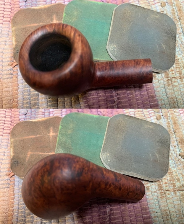 In order to lessen the burns damage on the rim, I ‘topped’ the pipe – that is to say, I gently and evenly sanded the rim on a piece of 400-grit sandpaper. This effectively minimized the damage, without altering the look of the pipe. Fortunately, this required only minimal topping.