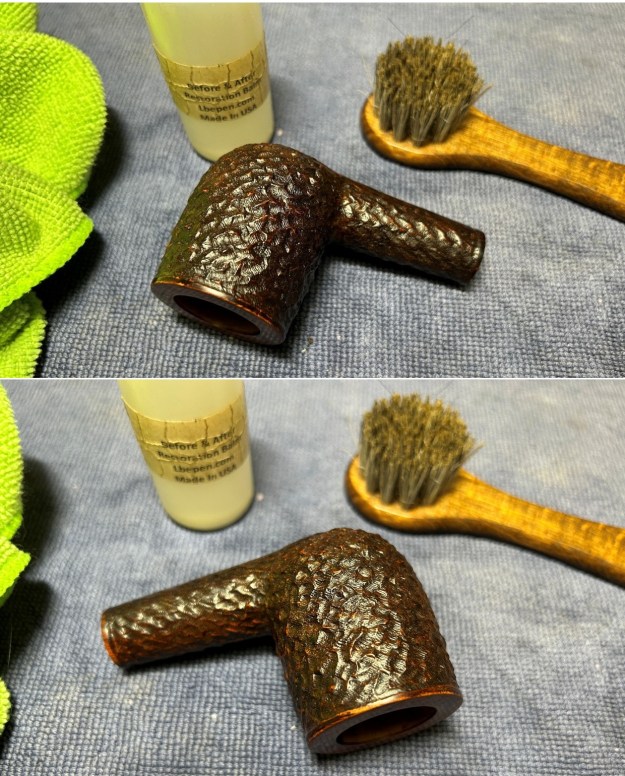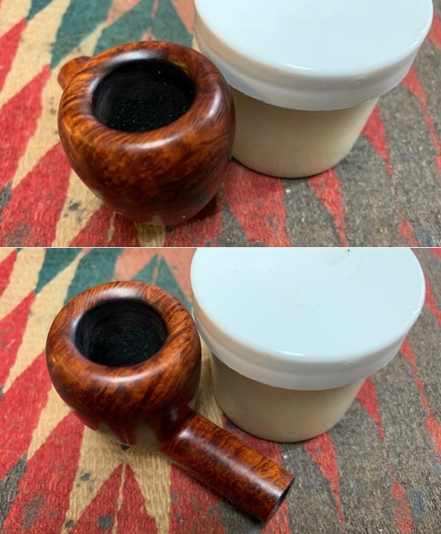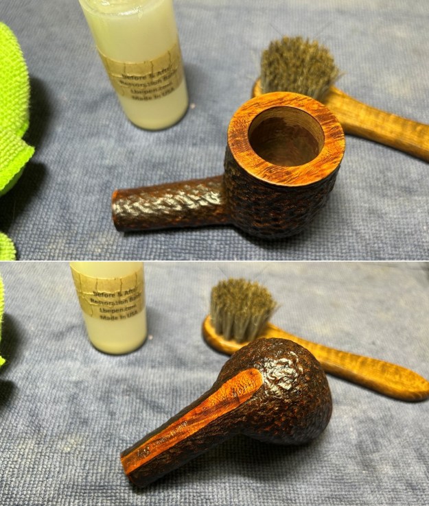 For the final step, I took the pipe to my bench polisher and carefully buffed it – first with a blue diamond compound, then with three coats of conservator’s wax. This procedure makes the pipe look its best – the stummel sings and the stem glows.