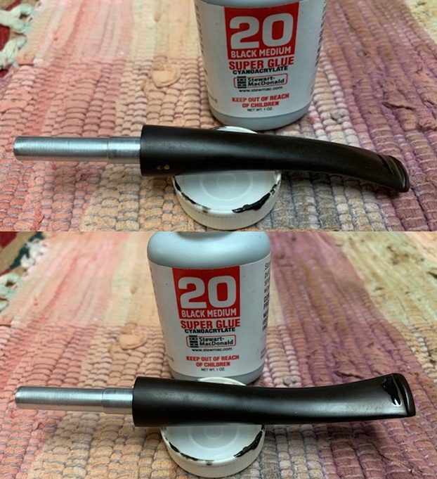 As the stem was now clean and dry, I set about fixing the marks and dents in the vulcanite. This was done by filling those divots with black cyanoacrylate adhesive, impregnated with carbon and rubber. I left this to cure and moved on.