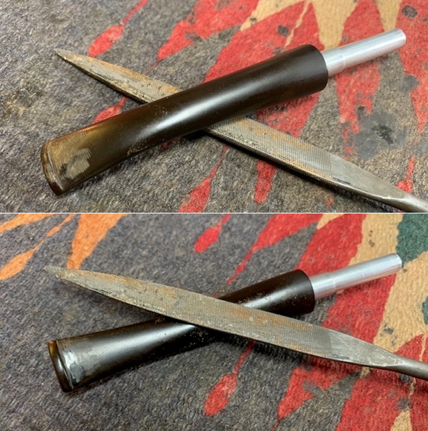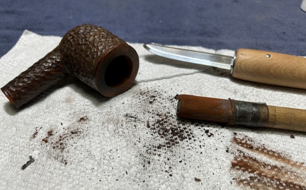 As the stem was (nearly) complete, I moved on to the stummel. The first step was to ream out the bowl – that is to say, remove all the cake inside the bowl. This accomplished a couple of things. First (and most obviously), it cleaned the bowl and provided a refurbished chamber for future smoking. Second, when the old cake was removed, I could inspect the interior walls of the bowl and determine if there was damage or not. I used a reamer, a pipe knife, and a piece of sandpaper taped to a wooden dowel. Collectively, these ensured that all the debris was removed.