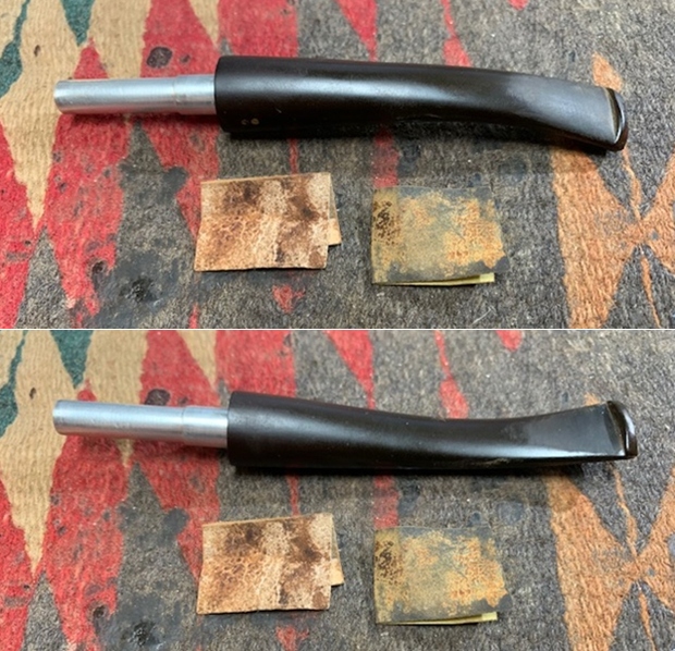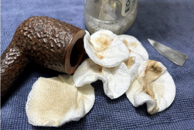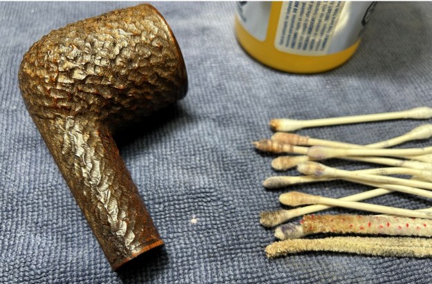 Similar to the stem, I then cleaned the stummel with both pipe cleaners and cotton swabs dipped in lemon-infused 99% isopropyl alcohol. With a pipe this dirty, it took quite a while and much cotton to clean. It was very dirty.