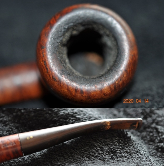 This is a beautiful pipe, but it did have some issues. The stem, however, was in good shape. Very dirty, to be sure, but not damaged. The stummel looks great – a bit dirty, some cake in the bowl and quite a bit of lava on the rim. I didn’t know it yet, but the lava hid some damage to the rim. This would be revealed later.