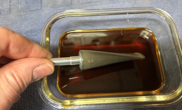 Once the stem was reasonably clean, I soaked it overnight in some Briarville Stem Oxidation Remover. This solution works to draw oxidation in the stem to the surface of the vulcanite. This is a major aid and an important step in ensuring a clean stem. The following day, I drew out the stem from its bath and scrubbed the lingering fluid with a toothbrush.