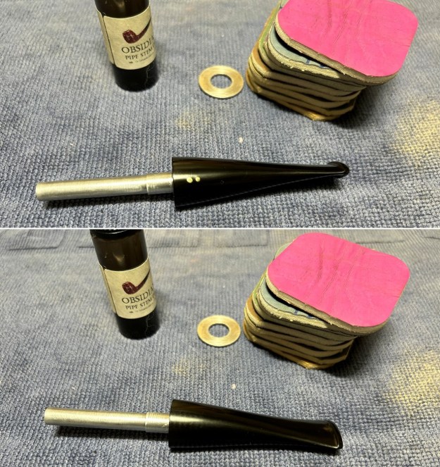 The penultimate step for the stem is sanding. First, with my set of needle files, I reduced the bulk of the cyanoacrylate repairs. I removed the excess adhesive as near to the surface as possible, without cutting into the vulcanite. Following that, I used all nine of the micromesh sanding pads (1,500 through 12,000 grit) to sand out flaws, even out the vulcanite, and provide gentle polishing of the finished surface. I also applied pipe-stem oil while using the last five micromesh pads. There was a wonderful, deep black shine to the stem when I was done.