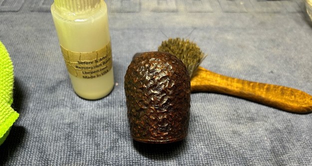 To tidy up the briar, I wiped down the outside, using a solution of a pH-neutral detergent and some distilled water, with cotton rounds. I also used a toothbrush in the crevices. This did a good job of cleaning any latent dirt on the surface of the briar. The last step of the cleaning process was to scour the inside of the stummel with the same mild detergent and tube brushes. This was the culmination of a lot of hard work in getting the pipe clean.