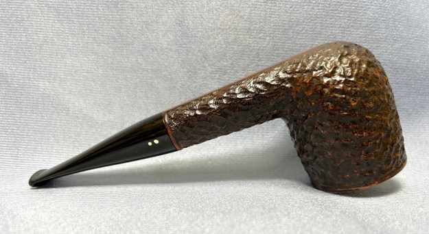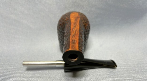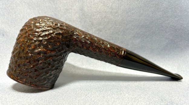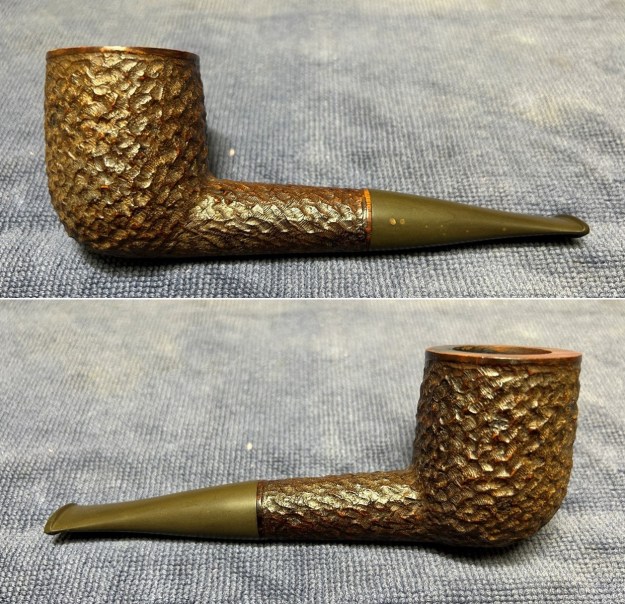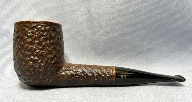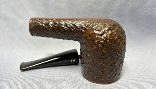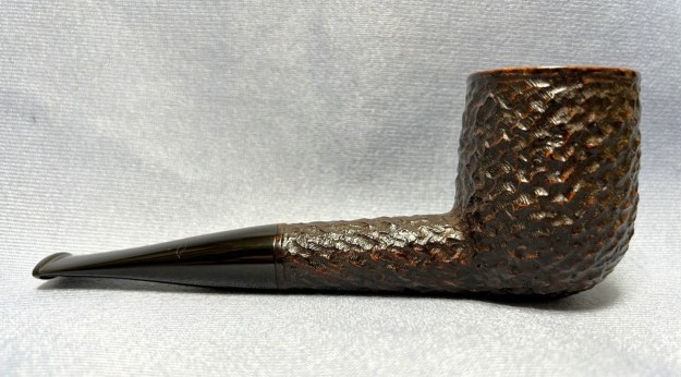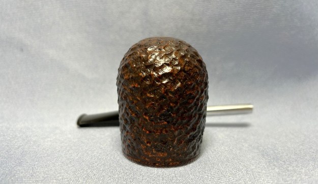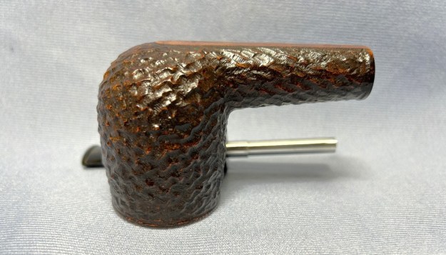 What a charming pipe this is! I got it in auction with a few other pipes, and I liked the shape of it immediately. This is a Brigham 3-dot scoop, with a handsome and rugged rustication. It really feels good in the hand. It has that look – no one could mistake it for anything but a Brigham. The tenon (which holds the maple distillator) on this pipe is made of aluminum – so it’s an older one. Curiously, it doesn’t have any shape number marked on it, nor is it listed in the book on Brigham pipes.