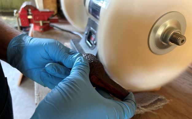 I took a solid wooden sphere, wrapped with my micromesh pads, and lightly sanded the inner edge of the rim. This achieved two things: first, it removed some of the burn marks; and second (and more importantly), the circular shape and motion of the sphere gradually returned the edge to a circle shape.