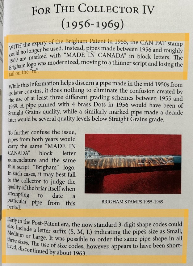 Thanks to Charles Lemon’s book, Brigham Pipes: A Century of Canadian Briar, dating this pipe was quite straightforward. On page 40, Lemon writes,