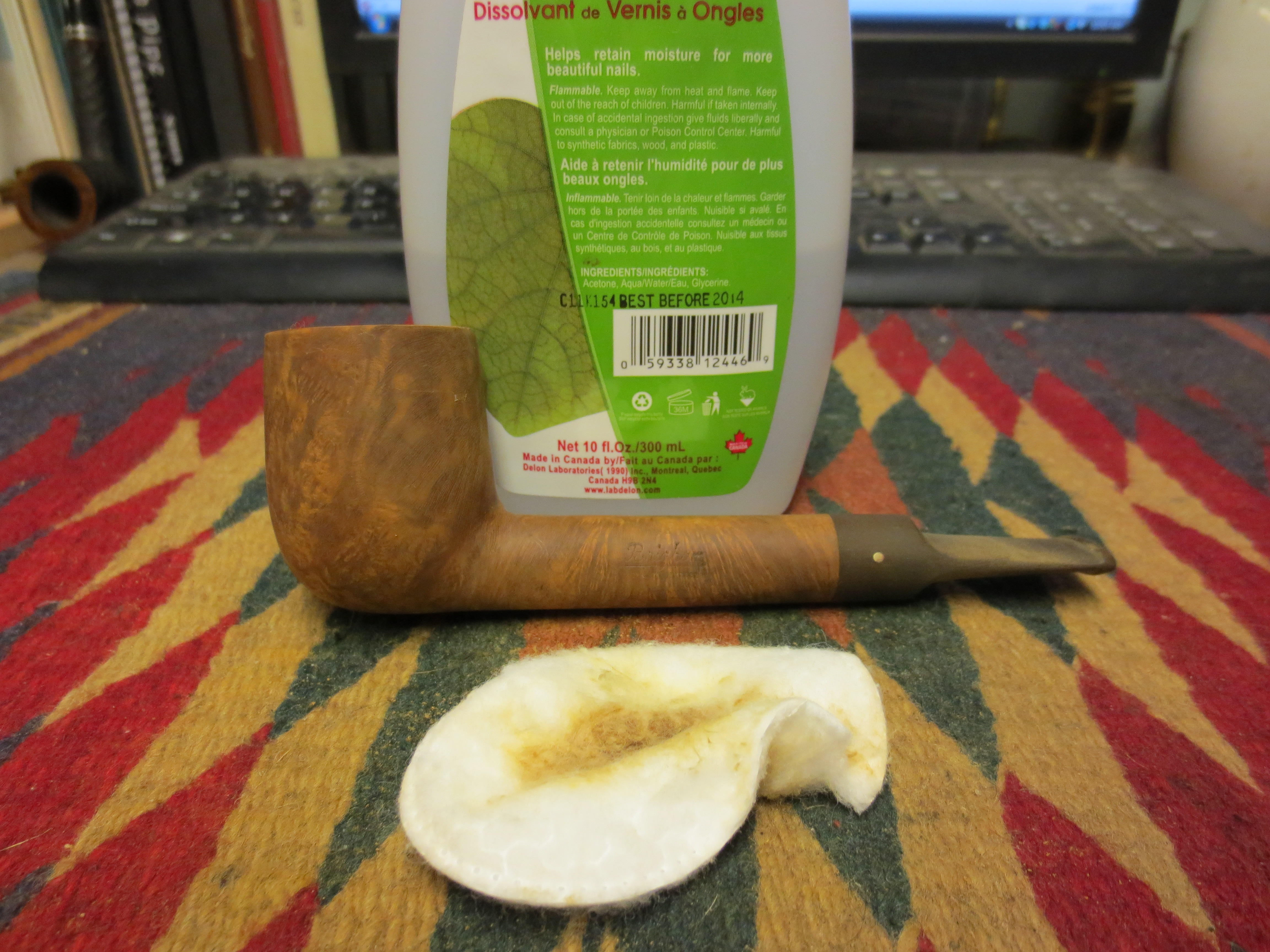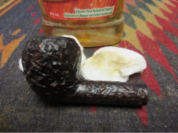 I then decided to ‘de-ghost’ the pipe – that is to say, exorcize the remaining filth from the briar. I filled the bowl and the shank with cotton balls, then saturated them with 99% isopropyl alcohol. I let the stummel sit overnight. This caused the remaining oils, tars and smells to leach out into the cotton.