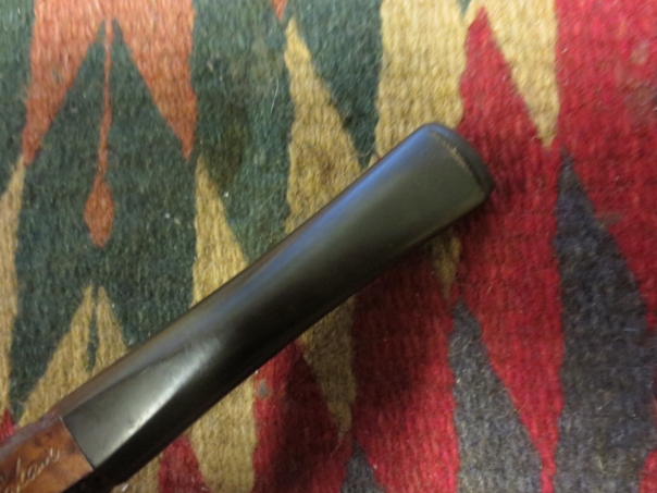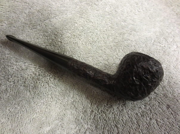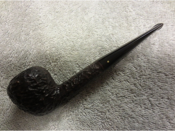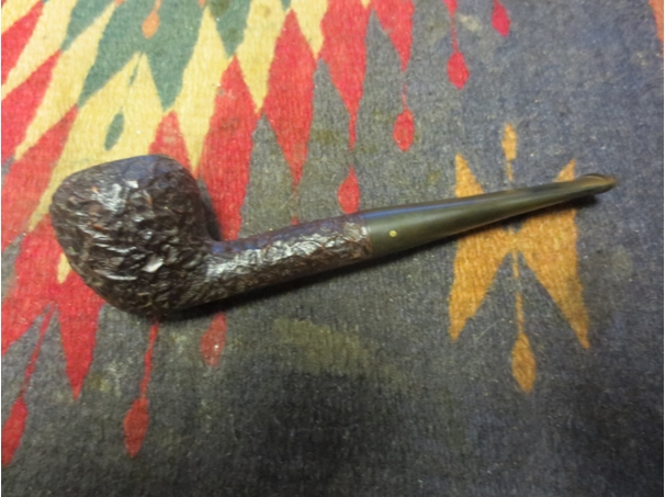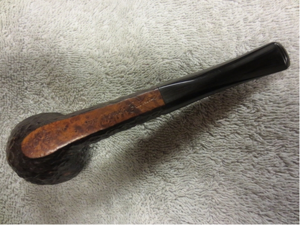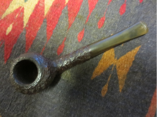 What a charming pipe this is! I got it in auction with a few other pipes, and I liked the shape of it immediately. This is a Brigham 3-dot scoop, with a handsome and rugged rustication. It really feels good in the hand. It has that look – no one could mistake it for anything but a Brigham. The tenon (which holds the maple distillator) on this pipe is made of aluminum – so it’s an older one. Curiously, it doesn’t have any shape number marked on it, nor is it listed in the book on Brigham pipes.