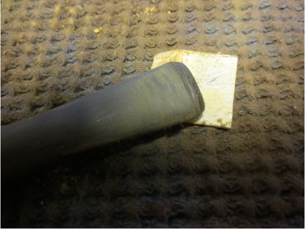 My next step was to remove the lava on the rim. For this, I took a piece of machine steel and gently scraped the lava away. The metal’s edge is sharp enough to remove what I need, but not so sharp that it damages the rim. This work revealed some significant burn damage to the rim. Unfortunate and annoying, but not catastrophic.