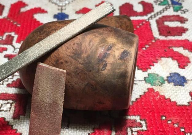 With the stem restoration complete, I turn to the stummel again. I use a flat needle file to begin the process of bringing the excess briar dust putty down to the briar surface. I start with the rim patches and move around the stummel. After using the flat needle file, I use 240 grit paper on each patch to bring it down to the surface. I finish the sanding and blending with 600 grit paper. At this point, I notice some air pockets in some of the patches. I spot drop a small bit of superglue in each and spray it with accelerator. After a few minutes, I sand down the superglue fills very quickly with the flat needle file, then 240, then 600. I take pictures along the way.