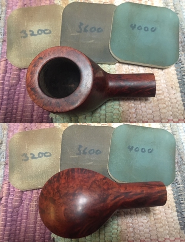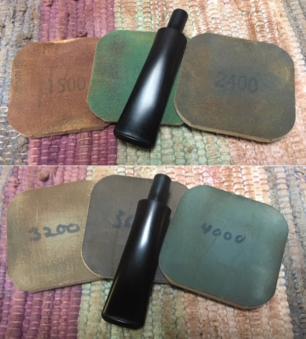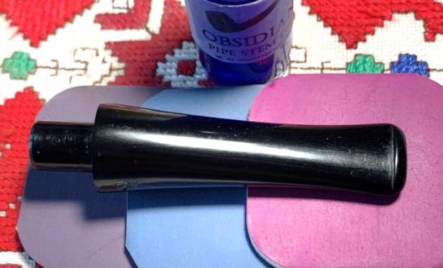 Next, the full regimen of 9 micromesh pads is used starting with wet sanding with pads 1500 to 2400. Following the wet sanding is dry sanding with pads 3200 to 4000 and 6000 to 12000. I apply Obsidian Oil between each set of 3 pads to further condition the stem and to guard the vulcanite from developing oxidation.