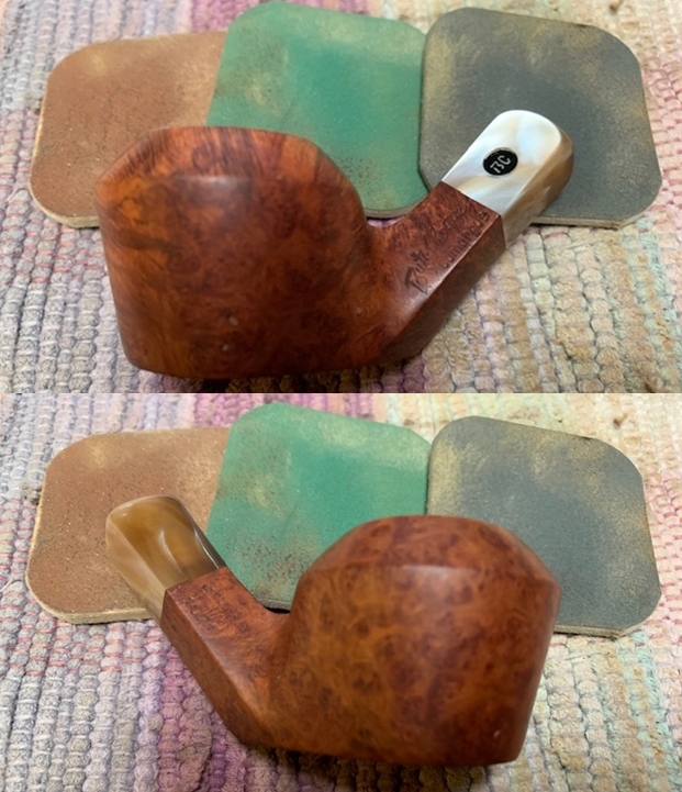 The home stretch – Using a cotton cloth buffing wheel on the rotary tool set at 49% full power, Blue Diamond compound is applied to the stem, acrylic ferrule, and smooth briar shank underside. Compound is not applied to the rusticated surface because it would clog the wood crevasses and be a bear to clean. A felt cloth is used to wipe off the compound dust where applied. Not pictured, after applying the Blue Diamond compound, another cotton cloth wheel is mounted on the rotary tool and carnauba wax is applied to the pipe. The wax is very lightly applied to the rusticated surface with the speed of the rotary tool a bit faster – at about 60 full power. I do this to create more heat which helps the wax to dissolve and not get stuck in the crevasses. Using the rotary tool buffing wheel helps as well as the bowl is rotated around to allow the wheel to go with the valleys and contours.