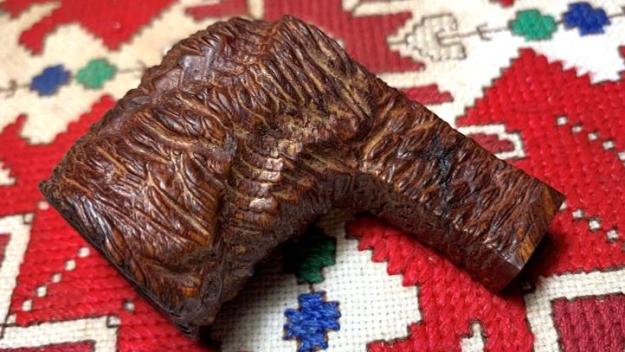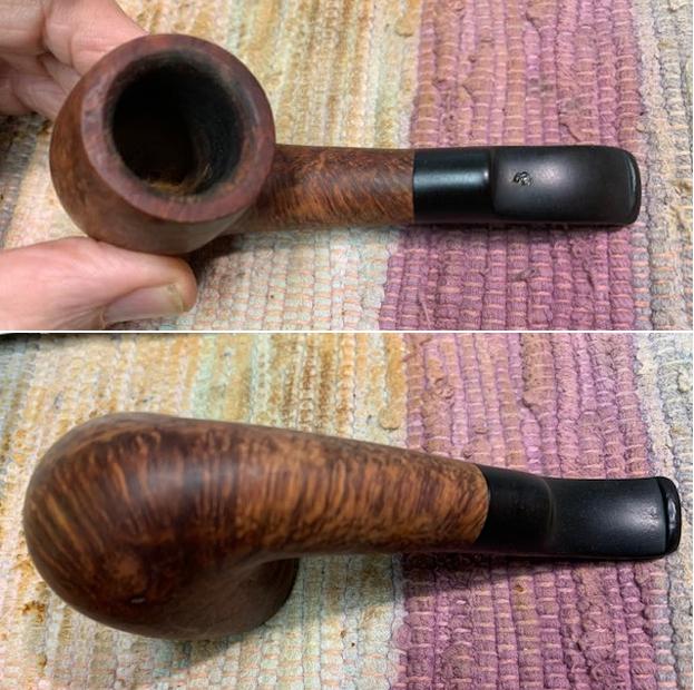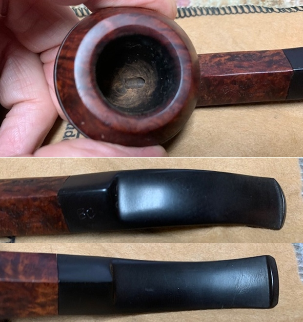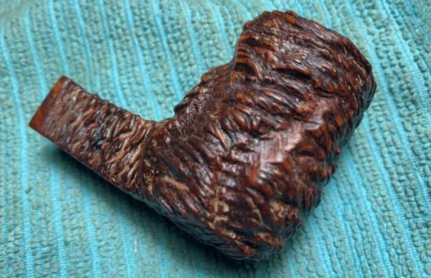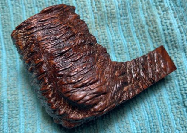 The briar seems parched throughout the rusticated surface. With this much carving, it’s difficult to tell if the finish has disappeared for the most part. It does look a bit ragged. The third picture below of the nomenclature on the underside of the stummel seems to indicate this is true with the splotchiness.