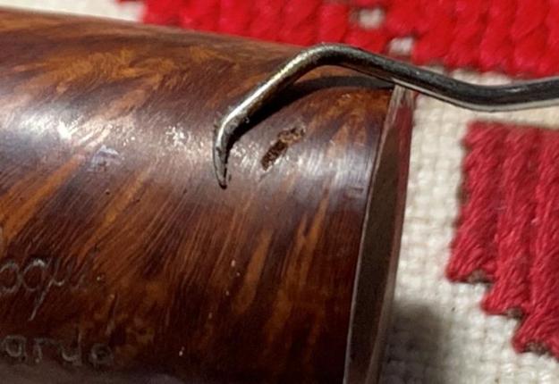 As I puzzle and pull and puzzle more, another mystery is birthed. With the gap between the briar and acrylic, my assumption is that the cap has partially become unseated – perhaps someone was trying to remove it and that caused the acrylic to break? I would guess that there would also be a gap internally – between the acrylic and the beginning of the briar mortise. To test my assumption on a second gap, a sharp dental probe is inserted into the mortise and the internal surface is scraped with the point I am expecting to detect another gap indicating that the ferrule had shifted down. I find no internal gap. The surface between briar and acrylic is smooth. This is important because I had been thinking, if I’m unable safely to remove the shank cap then I could try to reseat the shank cap by pressing it back into place on the shank and doing my best to close the gap from the acrylic break. Yet, if there is no internal gap, there’s no room for any movement of the shank cap to be reseated flush with the shank. It’s hard to believe a BC pipe left the Saint Claude workshop with a gap that large between the cap and the briar shank….