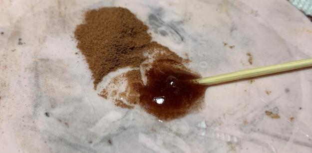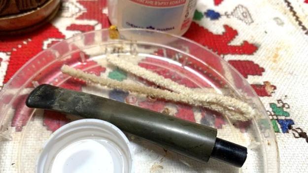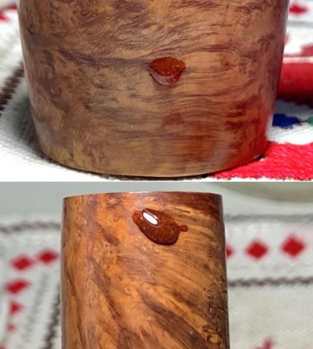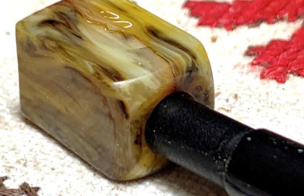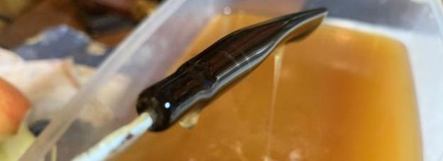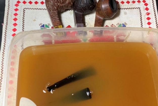 Finally, to help condition the vulcanite, paraffin oil, a mineral oil, is applied to the vulcanite rubber stem. The stem is then put to the side to absorb the oil.