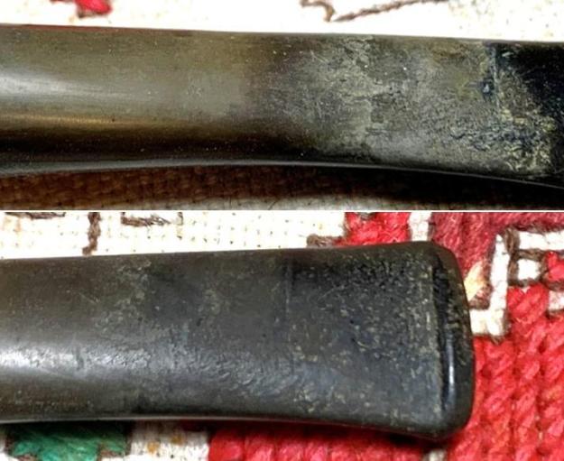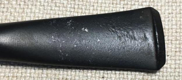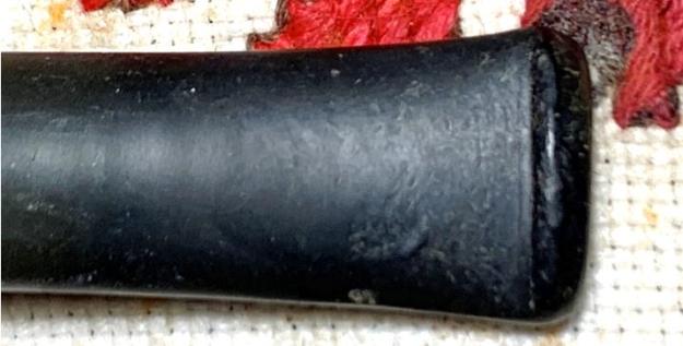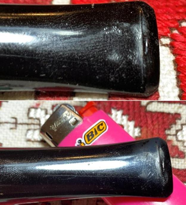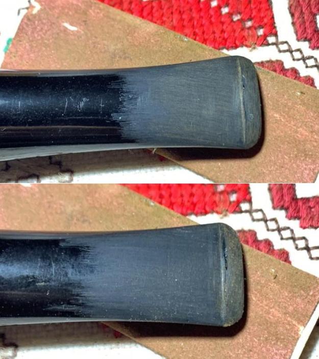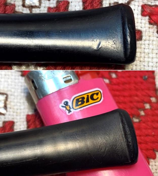 Earlier, the Fishtail stem went through a Before & After Deoxidizer soak. The stem looks good with no apparent residual oxidation. The upper and lower bit have tooth chatter, and the vulcanite surface is rough. To address the chatter, I use a Bic lighter and paint the bit with the flame to heat and expand the rubber compound. As the vulcanite heats, it also expands reclaiming its original disposition or at least in part. The before and after pictures show the results. This stem responded well which means that sanding will now be less.