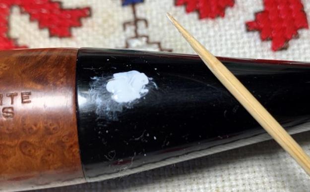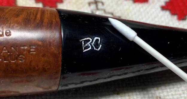 To begin the restoration of this Butz-Choquin Costaud, I start with the fishtail stem. The airway is cleaned using a pipe cleaner wetted with isopropyl 99%.