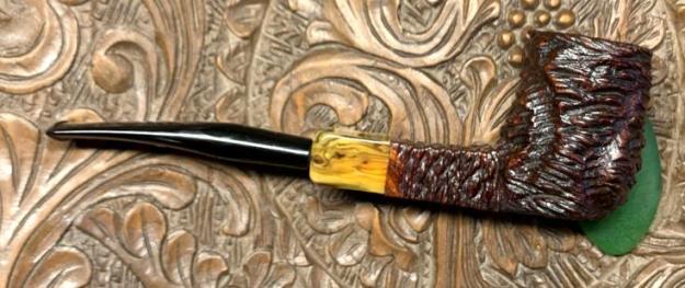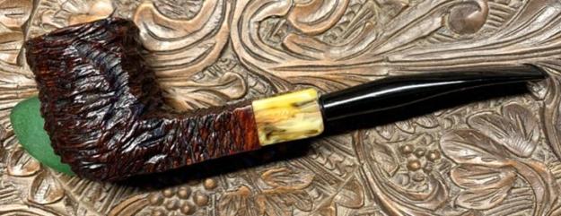 Craig commissioned a striking pipe. The cracked acrylic ferrule gets the attention quickly and overshadows other issues. The chamber needs to be cleaned of the cake buildup and the rusticated rim has blackened lava overflow that needs cleaning. The rusticated stummel is eye catching but needs cleaning in the deep crooks and crevasses of the briar surface. The fishtail stem has light oxidation and tooth chatter on the upper and lower bit.