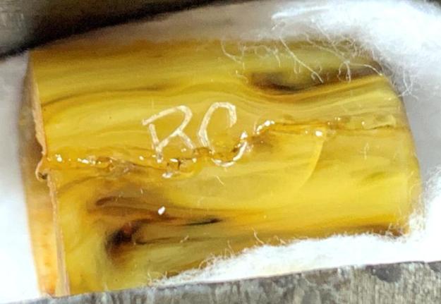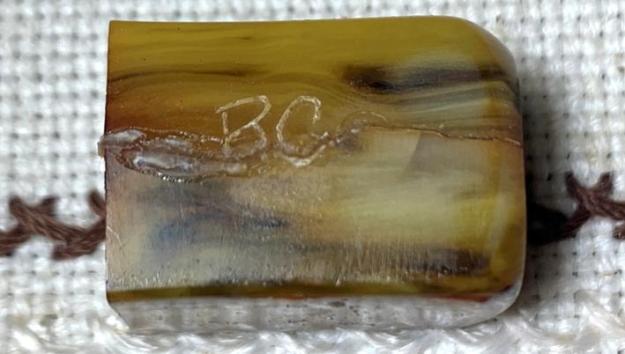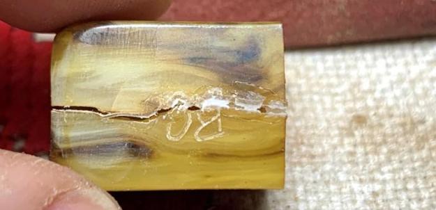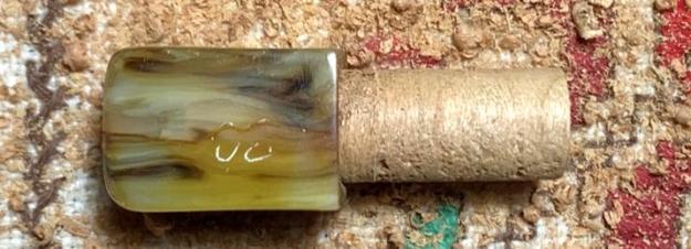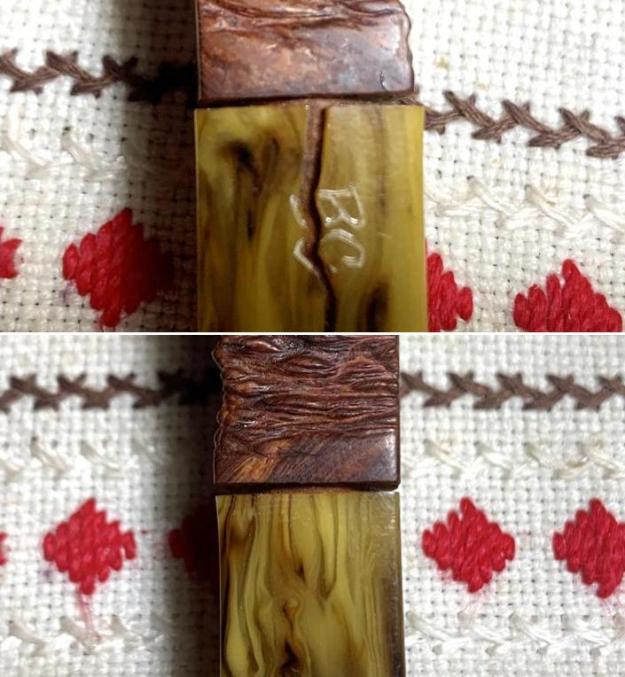 I continue to remove the old patch material with 240 grade paper trying to salvage as much of the BC stamping as possible – though I know that it will not remain unscathed. The good news now is that with the torque issue resolved, when the cap is mounted on a newly fashioned briar plug later, there should be no stress on the acrylic. The cap will simply go over the plug like a glove and glued in place. The mounting and the glue on the inside will again reinforce the patch. So, the crack repair doesn’t necessarily need to be uber strong but becomes more of a cosmetic issue – in theory!