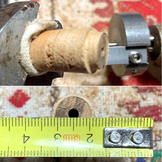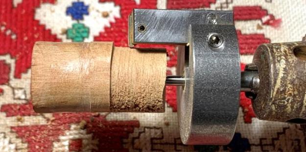 The carbide cutter arm is adjusted to barely contact the cherry wood and tightened. The target diameter is about 7/16 inches or 11mm – the diameter of the acrylic shank caps interior.