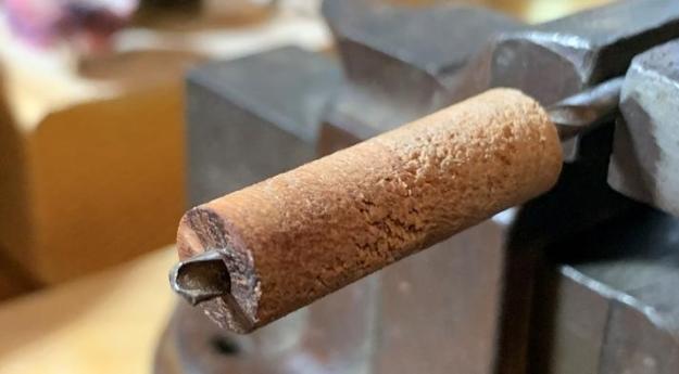 To complete the structural issues, the replacement fishtail stem’s tenon needs to be properly sized to navigate safely the mortise. To do this, the tenon diameter is decreased and the mortise is expanded to accommodate the resized tenon. I use a coarse 120 grade sanding paper to sand down the tenon. I do this by pinching the paper around the tenon and rotating the stem.