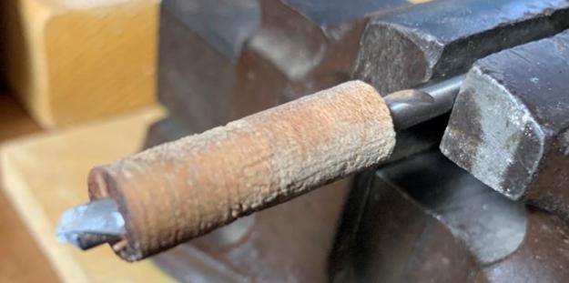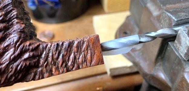 Starting with a drill bit that is a bit larger than the airway, the end of the bit is clamped in the vice and the stummel is rotated. I hand turn the stummel allowing the bit to follow the airway’s path of least resistance. The depth I’m aiming for is about 1/2 inch and I mark off drill bit with tape. The most difficult part is starting the drill bit making sure it’s as straight as possible and avoiding wobbles. Once the bit starts tracking down the airway it becomes easier.
