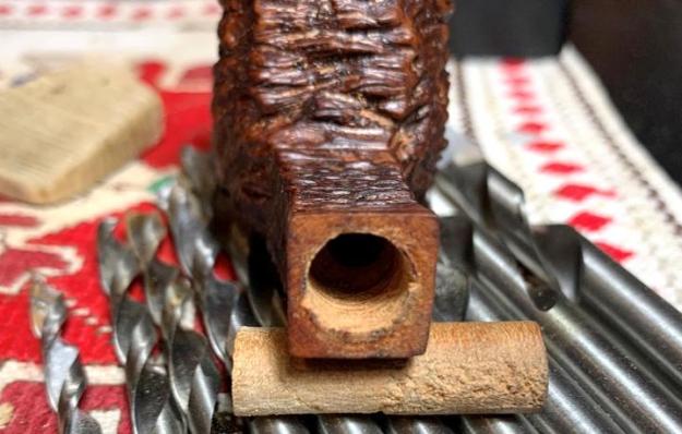 To remove the briar remains from the shank cap, I begin the process with drill bits. Using a bit just larger than will freely pass through the airway, I hand turn the bit to ream out the wood a little at a time. I then graduate to two larger bits, hand turning and expanding the bite each time and removing a little more briar.