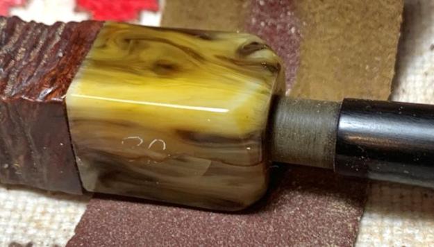 The next step is to sand down the stem side of the joint so that the acrylic shank cap fits over the joint and is flush with the shank. With the joint seated a half-inch in the shank, the picture shows the excess length – about 1/16 inch.