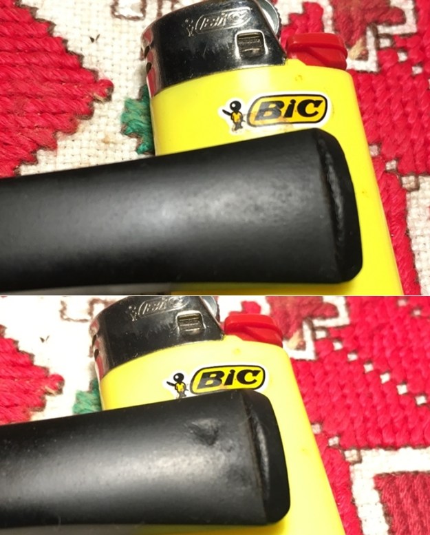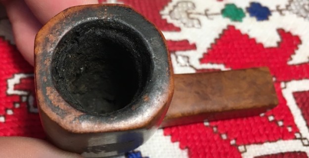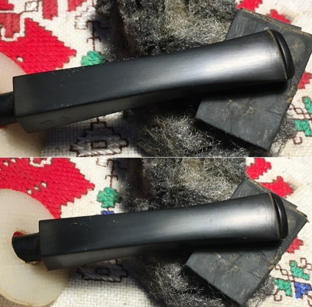 I scrubbed the stem with Murphy’s Oil Soap on some cotton pads. I also took a BIC lighter and ‘painted’ the stem with its flame in order to lift the few bite marks and dents. Then I cleaned out the inside with pipe cleaners and lemon-infused isopropyl alcohol.