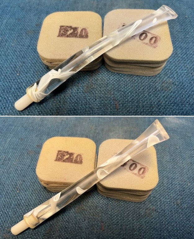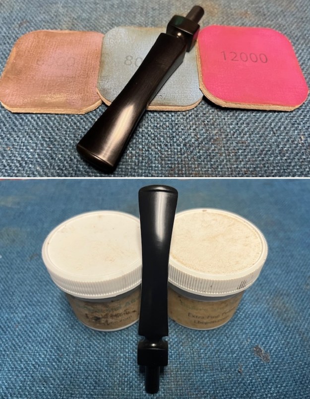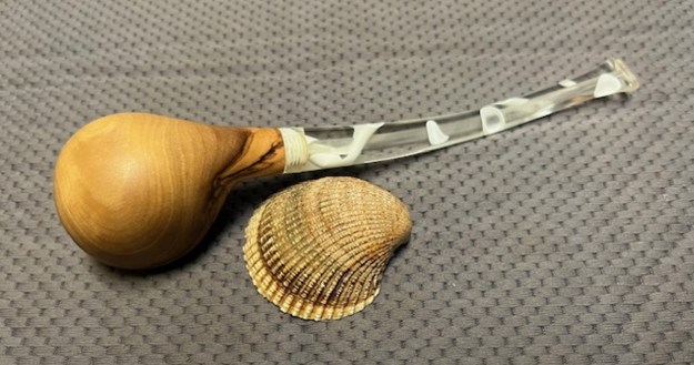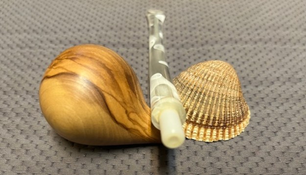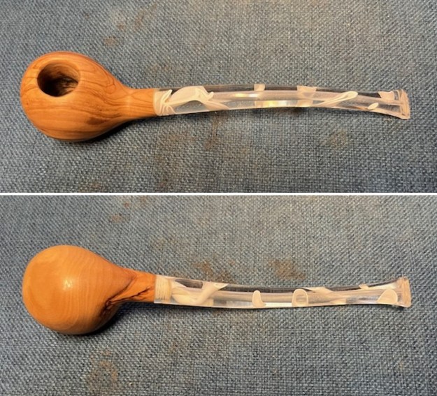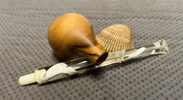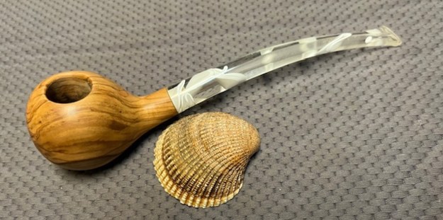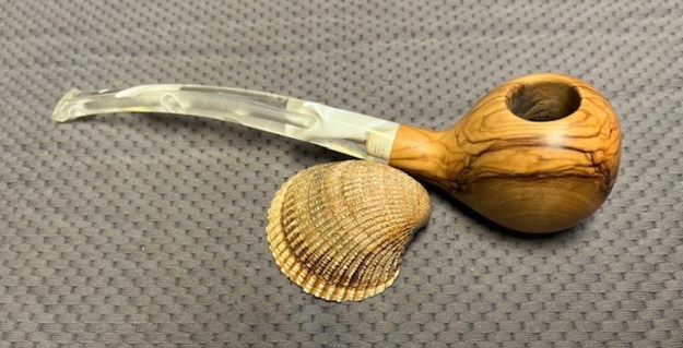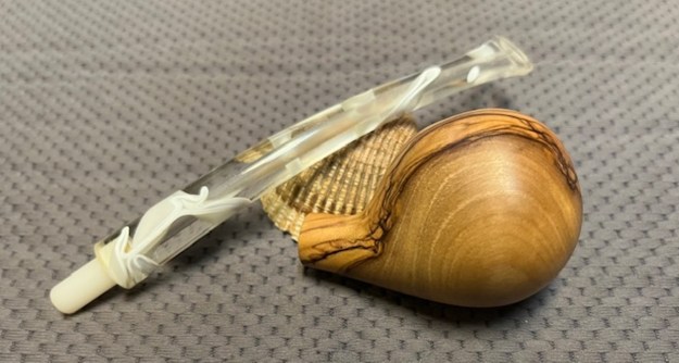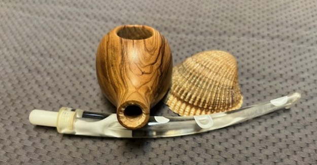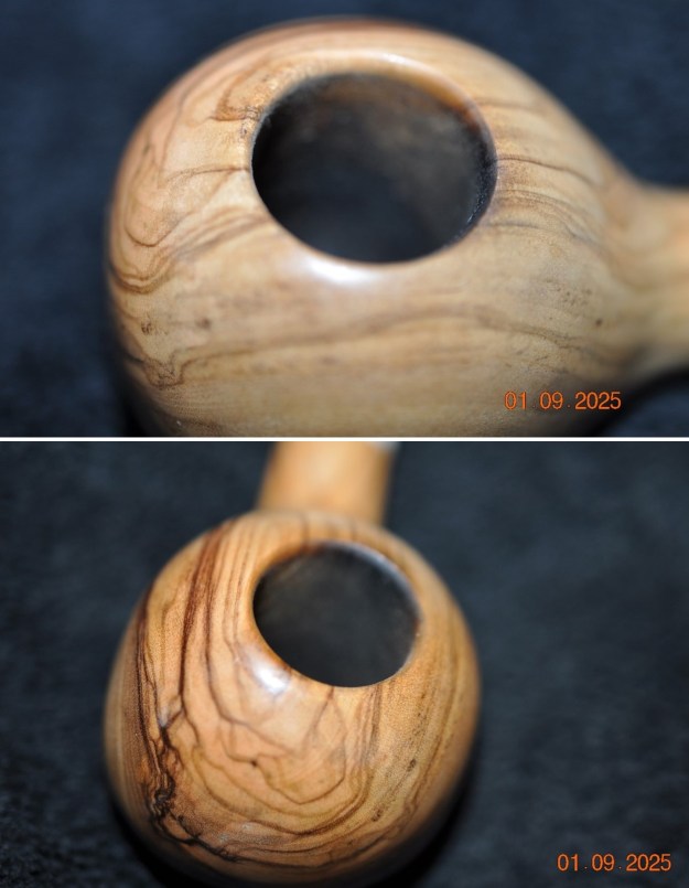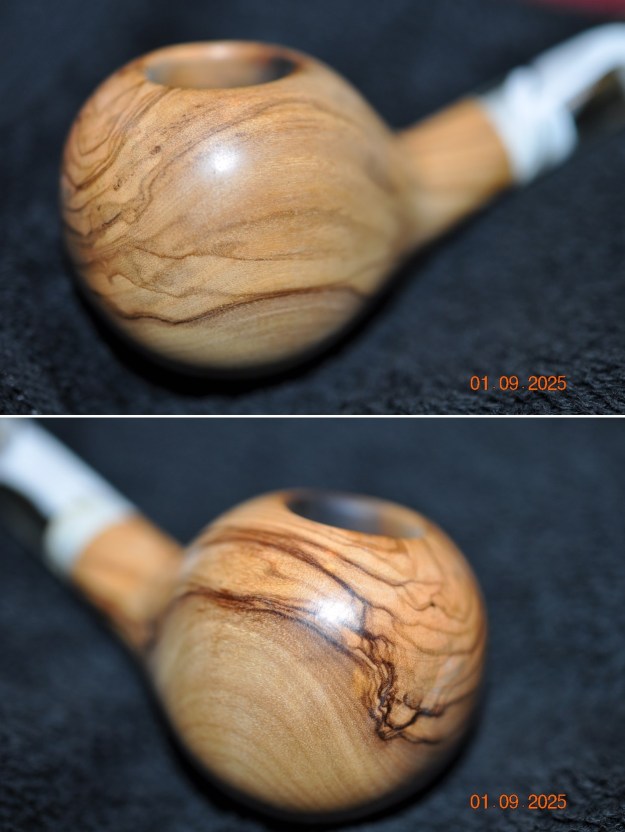 The next pipe I chose to work on was one that we purchased on 12/28/2024 from as part of an estate that belonged to a pipeman and carver, Byron Harwood from Missoula, Montana, USA. This Olivewood pipe was one of Byron’s own handmade pipes. It is a lovely piece of olivewood that was shaped with an apple bowl that highlighted the grain. The bowl and shank were smooth and highlighted some beautiful grain around the bowl sides and shank. The airway in the mortise and shank are well executed and the draught is very good. The bowl was lightly smoked and there was debris in the bowl. There was some darkening around the inner edge of the bowl and top. The stem is a clear acrylic with spots or bubbles of white that look quite intriguing. It has a great fit to the shank, has been bent to fit the angles of the pipe. The tenon is a white Delrin that is screwed into the stem. The button is fishtail and well finished. The pipe fit well in the hand and had a small bowl but there was a charm to it! Here is what it looked like when Jeff received it. He took some photos of the rim top and bowl from various angles to give me a clear picture of the condition of the rim top and bowl. You can see the light cake in the bowl and the darkening and light lava coat on the inner edge and rim top. He also took photos of the stem. It is dirty and has light tooth chatter on both sides at the button. Jeff took some photos of the sides of the bowl to show the condition of the finish on the pipe. The photos showed grain around the bowl sides. Under the oils and grime it was a nice looking bowl. It is a large pipe with a smooth rim top and heel. Jeff did his usual thorough job cleaning the pipe which I really appreciate because of the freedom it gives me in dealing with pipes. He reamed it with a PipNet pipe reamer and got rid of the cake. He cleaned up the reaming with a Savinelli Fitsall Pipe Knife so that we could see the walls of the bowl and assess for damage. He cleaned the internals of the shank and stem with alcohol, pipe cleaners and alcohol. He scrubbed the exterior with undiluted Murphy’s Oil Soap and a tooth brush. He rinsed the pipe under warm water. He dried it off with a cloth and then let it air dry. The stem was scrubbed with Soft Scrub and had a soak in Before & After Deoxidizer to remove the oxidation. One it was rinsed off, it came out looking very good. The finish on the bowl and the rim top cleaned up nicely. I took pictures of the pipe to show how it looked when I unpacked it. I took a close up photo of the bowl and rim top to show how clean the pipe was. The stem looked good just some light tooth chatter and marks near the button. Overall the pipe is a beautiful looking piece.I also removed the stem from the shank and took photos of the pipe to show the look of the parts. The stem is long but the pipe is mini Churchwarden.I sanded the olivewood bowl with 320-3500 sanding pads. I wiped the briar down with a damp cloth after each sanding pad. It began to look very good. I polished the bowl with micromesh sanding pads – wet sanding with 1500-12000 grit pads and wiping it down after each sanding pad with a damp cloth. The grain of the olivewood began to shine. I worked some Before & After Restoration Balm into the surface with my finger tips. I let it sit on the bowl for 10 minutes and then buffed it off with a paper towel and soft cloth. The product is a great addition to the restoration work. It enlivens, enriches and protects the wood while giving it a deep glow. It is a product I use on every pipe I restore. I set the bowl aside and worked on the stem. I sanded out the light tooth marks and chatter with 320-3500 grit sanding pads. I wiped the stem down with an Obsidian Oil cloth after each sanding pad. The stem looked better at this point. I polished the stem with micromesh sanding pads – wet sanding with 1500-12000 grit sanding pads. I wiped it down after each sanding pad with Obsidian Oil. I polished it with Before & After Pipe Stem Polish – both Fine and Extra Fine. I buffed the stem with a soft cloth to raise the shine. I gave it a final wipe down with Obsidian Oil to protect the stem from UV and slow down future oxidation. I don’t know what it is about finishing a restoration but I have to tell you that it is my favourite part of the process. It is the moment when everything that I have worked on comes together. I can compare it to where I started and there is always satisfaction that it does indeed look better than when we picked it up. As always, I put this Byron Harwood Olivewood Mini Churchwarden back together and buffed it with Blue Diamond on the buffing wheel. I gave the bowl and the stem multiple coats of carnauba wax. I buffed the pipe with a clean buffing pad and hand buffed it to raise the shine. It is fun to see what the polished bowl looks like along with the polished clear acrylic stem. This Byron Harwood Olivewood Churchwarden is a great looking pipe and I am sure that it will be comfortable in hand when smoking as it is light and well balanced for a pipe of this size. Have a look at it with the photos below. The dimensions are Length: 7 ½ inches, Height: 1 ¾ inches, Outside diameter of the bowl: 1 ½ inches, Chamber diameter: 5/8 of an inch. The weight of the pipe is 1.80 ounces/52 grams. It is another beautiful pipe and one that will be on the rebornpipes store soon. You can find it in the section of Pipes by American Pipe Makers. If you are interested in adding it to your collection let me know. Thanks for walking through the restoration with me as I worked over this pipe. Thanks to each of you who are reading this blog.