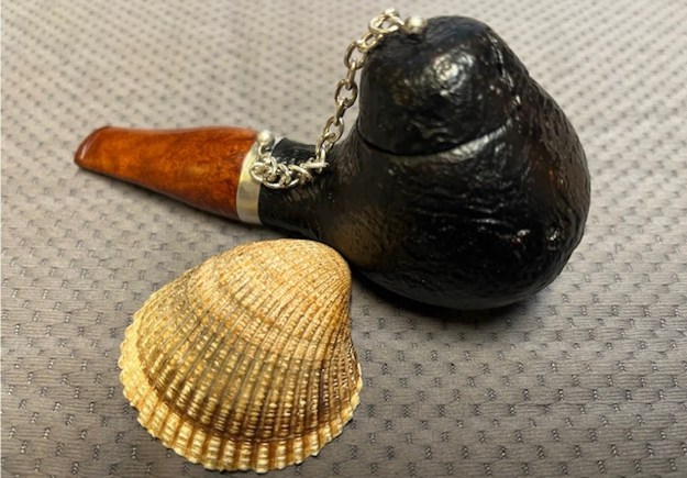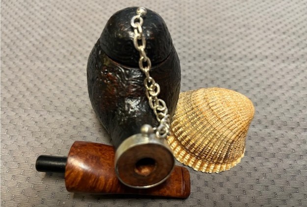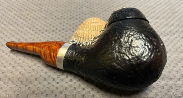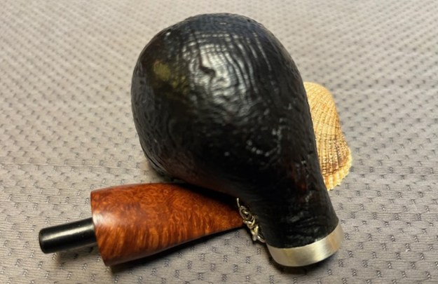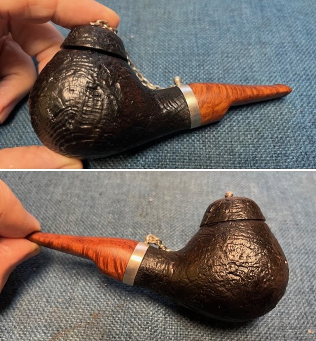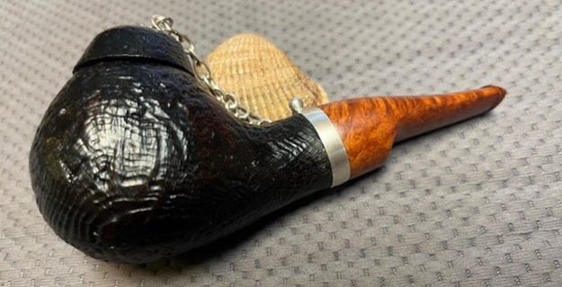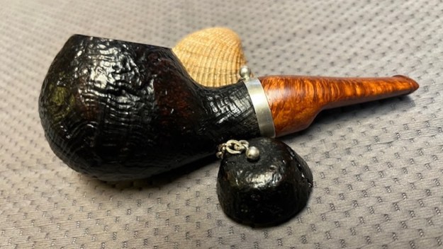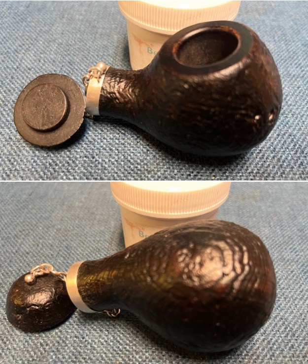 The next pipe I chose to work on was one that we purchased on 12/28/2024 from as part of an estate that belonged to a pipeman and carver, Byron Harwood from Missoula, Montana, USA. This unique, capped all briar pipe was one of Byron’s own handmade pipes. As with the previous pipe of Byron’s this one does not bear any stamping. It is a lovely piece of briar that was shaped with an apple bowl and sandblasted to highlight the grain. The airway in the mortise and shank are well executed and the draught is very good. The bowl had a moderated cake and there was some darkening and lava around the inner edge of the bowl and top. The cap on the bowl was pressure fit and attach to a shank band. It sealed the bowl so it would be a good pipe to load and carry in a pocket or bag for later use. It is not a wind cap. The chain and band are tarnished and are made of Sterling Silver. Smoking the pipe had removed the stain and finish on the inside of the cap. The stem is briar in a half saddle shape. It is smooth and nicely grained. It has been stained with a tan stain and has a great fit to the shank. The tenon is a black Delrin that is set in the stem. The button is well finished and the exit of the airway is orific or round rather than slotted. The pipe fit well in the hand and was short and stubby like a nose warmer. There was a charm to it! Here is what it looked like when Jeff received it. He took some photos of the rim top and bowl from various angles to give me a clear picture of the condition of the rim top and bowl. You can see the light cake in the bowl and the darkening and light lava coat on the inner edge and rim top. He also took photos of the all briar stem. It is dirty and has light tooth chatter on both sides ahead of the button. Jeff took some photos of the sides of the bowl to show the condition of the finish on the pipe. The photos showed rich sandblast, highlighting grain around the bowl sides. Under the dust it was a nice looking bowl and cap. It is a nose warmer sized pipe sandblasted briar cap. It is on pipes like this that I really appreciate Jeff’s thorough cleaning process. It gives me real freedom in dealing with pipes when they arrive here. He reamed it with a PipNet pipe reamer and got rid of the cake. He cleaned up the reaming with a Savinelli Fitsall Pipe Knife so that we could see the walls of the bowl and assess for damage. He cleaned the internals of the shank and stem with alcohol, pipe cleaners and alcohol. He scrubbed the exterior with undiluted Murphy’s Oil Soap and a tooth brush. He rinsed the pipe under warm water. He dried it off with a cloth and then let it air dry. The stem was scrubbed with Murphy’s Oil Soap and a tooth brush at the same time as the bowl. Once it was rinsed off, it came out looking very good. The finish on the bowl and the rim top and cap cleaned up nicely. I took pictures of the pipe to show how it looked when I unpacked it. The pictures show it with the cap in place on the top of the bowl and with it removed. I took a photo of the pipe with the briar stem removed to show the Delrin tenon and the look of the parts of the pipe to give a sense of size and perspective.I polished the bowl rim top and the inside of the bowl cap with micromesh sanding pads – dry sanding with 1500-12000 grit pads and wiping it down after each sanding pad with a damp cloth. I worked some Before & After Restoration Balm into the surface of the briar with my finger tips. I let it sit on the bowl for 10 minutes and then buffed it off with a paper towel and soft cloth. The product is a great addition to the restoration work. It enlivens, enriches and protects the wood while giving it a deep glow. It is a product I use on every pipe I restore. I set the bowl aside and turned to the all briar stem. I polished it with micromesh sanding pads – dry sanding with 1500-12000 grit sanding pads. I wiped it down after each sanding pad with Obsidian Oil. I polished it with Before & After Pipe Stem Polish – both Fine and Extra Fine. I buffed the stem with a soft cloth to raise the shine. I gave it a final wipe down with Obsidian Oil to protect it. I don’t know what it is about finishing a restoration but I have to tell you that it is my favourite part of the process. It is the moment when everything that I have worked on comes together. I can compare it to where I started and there is always satisfaction that it looks better than when we picked it up. As always, I put this Byron Harwood All Briar Nose Warmer back together and buffed it with Blue Diamond on the buffing wheel. I gave the bowl and the stem multiple coats of carnauba wax. I buffed the pipe with a clean buffing pad and hand buffed it to raise the shine. It is fun to see what the polished bowl looks like along with the polished All Briar stem. This Byron Harwood All Briar Capped Nose Warmer is a great looking pipe and I am sure that it will be comfortable in hand when smoking as it is light and well balanced for a pipe of this size. Have a look at it with the photos below. The dimensions are Length: 5 inches, Height: 1 ¾ inches without the cap and 2 ¼ inches with the cap, Outside diameter of the bowl: 1 ¼ inches, Chamber diameter: ¾ of an inch. The weight of the pipe is 2.79 ounces/78 grams. It is another beautiful pipe and one that will be on the rebornpipes store soon. You can find it in the section of Pipes by American Pipe Makers. If you are interested in adding it to your collection let me know. Thanks for walking through the restoration with me as I worked over this pipe. Thanks to each of you who are reading this blog.