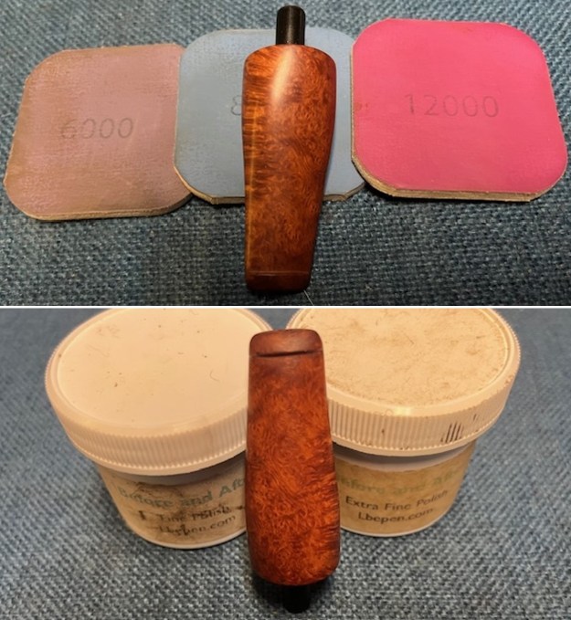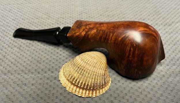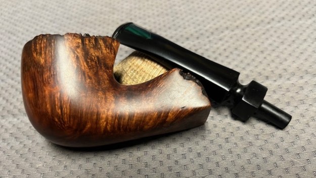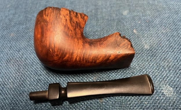 The next pipe I chose to work on was one that we purchased on 12/28/2024 from as part of an estate that belonged to a pipeman and carver, Byron Harwood from Missoula, Montana, USA. This Freehand was one of Byron’s own handmade pipes. It is a lovely piece of plateau briar (rim top and shank end) that was shaped with an apple bowl that highlighted the grain. The bowl and shank were smooth and highlighted some beautiful grain. The airway in the mortise and shank are well executed and the draught is very good. The bowl was unsmoked and other than dusty when we received it, the pipe was in excellent condition. The stem that came with it really did not fit – more of a Lovat style saddle stem on a midsized freehand. It looked like it had just been put in the shank before shipping. Everything about the stem said “restem me” to this repair guy. The pipe fit well in the hand and had a small bowl but there was a charm to it! Here is what it looked like when I brought it home from Jeff’s place. I took some photos of the rim top and bowl to give a clear picture of the condition of the rim top and bowl. You can see the drilling and the plateau. It is an unusual pipe. I also took photos of the stem to show its condition also the general look of it and why I don’t think it is a good fit.I sanded the briar bowl with 320-3500 sanding pads. I wiped the briar down with a damp cloth after each sanding pad. It began to look very good. I polished the bowl with micromesh sanding pads – wet sanding with 1500-12000 grit pads and wiping it down after each sanding pad with a damp cloth. The grain of the briar began to shine. I worked some Before & After Restoration Balm into the surface with my finger tips. I let it sit on the bowl for 10 minutes and then buffed it off with a paper towel and soft cloth. The product is a great addition to the restoration work. It enlivens, enriches and protects the wood while giving it a deep glow. It is a product I use on every pipe I restore. I went through my stems and found an acceptable acrylic saddle stem. It had been used for a short time and the airway was stained with dark tobacco stains. I would be able to remove some of the stain but not all. I took a photo of the two stems together. I put it in the shank of the bowl at hand and took a photo of the look with a new stem. The combination works very well.I cleaned the airway in the stem with alcohol and pipe cleaners – smooth and bristle. I followed up on that by cleaning it again with Soft Scrub cleanser. I gave it a quick rinse of alcohol to remove the residue of the cleanser and the swirls of tans, creams, ivory, browns and black look very good. There is some heavy darkening stain that I cannot remove but the stem is very clean.I set the bowl aside and worked on the stem. I filled in the tooth marks in the acrylic with clear CA glue. Once they cured I flattened the repairs with a small file and then sanded the repairs smooth with 220 grit sandpaper. I sanded out the light tooth marks and chatter with 320-3500 grit sanding pads. I wiped the stem down with an Obsidian Oil cloth after each sanding pad. The stem looked better at this point.I polished the stem with micromesh sanding pads – wet sanding with 1500-12000 grit sanding pads. I wiped it down after each sanding pad with Obsidian Oil. I polished it with Before & After Pipe Stem Polish – both Fine and Extra Fine. I buffed the stem with a soft cloth to raise the shine. I gave it a final wipe down with Obsidian Oil to add shine to the acrylic. I don’t know what it is about finishing a restoration but I have to tell you that it is my favourite part of the process. It is the moment when everything that I have worked on comes together. I can compare it to where I started and there is always satisfaction that it does indeed look better than when we picked it up. As always, I put this Byron Harwood Freehand Apple and new stem back together and buffed it with Blue Diamond on the buffing wheel. I gave the bowl and the stem multiple coats of carnauba wax. I buffed the pipe with a clean buffing pad and hand buffed it to raise the shine. It is fun to see what the polished bowl looks like along with the polished clear acrylic stem. This Byron Harwood Freehand Apple is a great looking pipe and I am sure that it will be comfortable in hand when smoking as it is light and well balanced for a pipe of this size. Have a look at it with the photos below. The dimensions are Length: 6 inches, Height: 2 inches, Outside diameter of the bowl: 1 ½ inches, Chamber diameter: ¾ of an inch. The weight of the pipe is 2.26 ounces/64 grams. It is another beautiful pipe and one that will be on the rebornpipes store soon. You can find it in the section of Pipes by American Pipe Makers. If you are interested in adding it to your collection let me know. Thanks for walking through the restoration with me as I worked over this pipe. Thanks to each of you who are reading this blog.