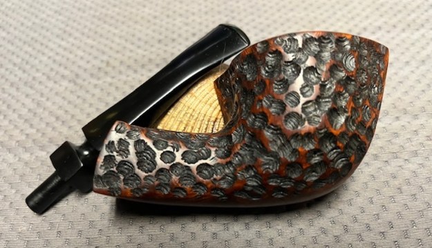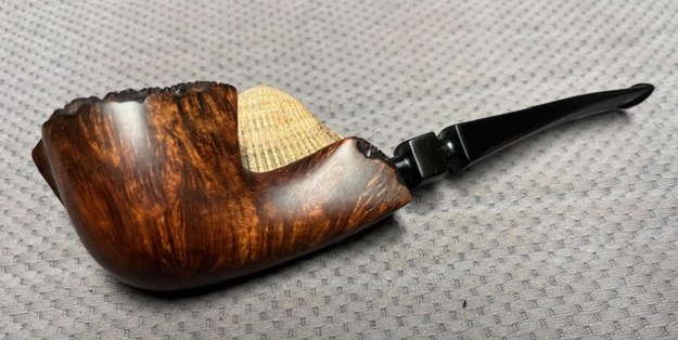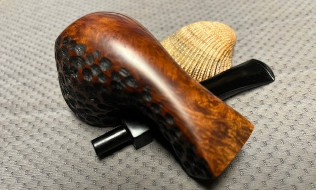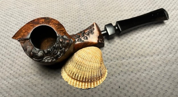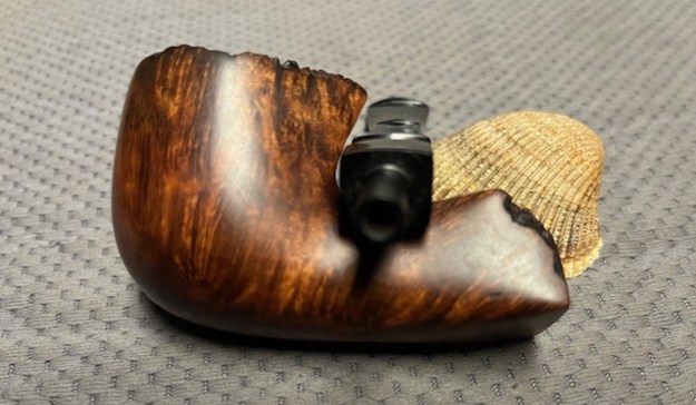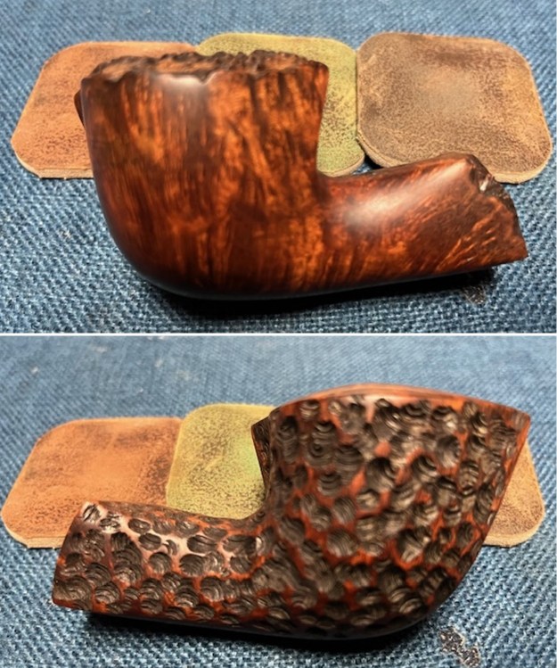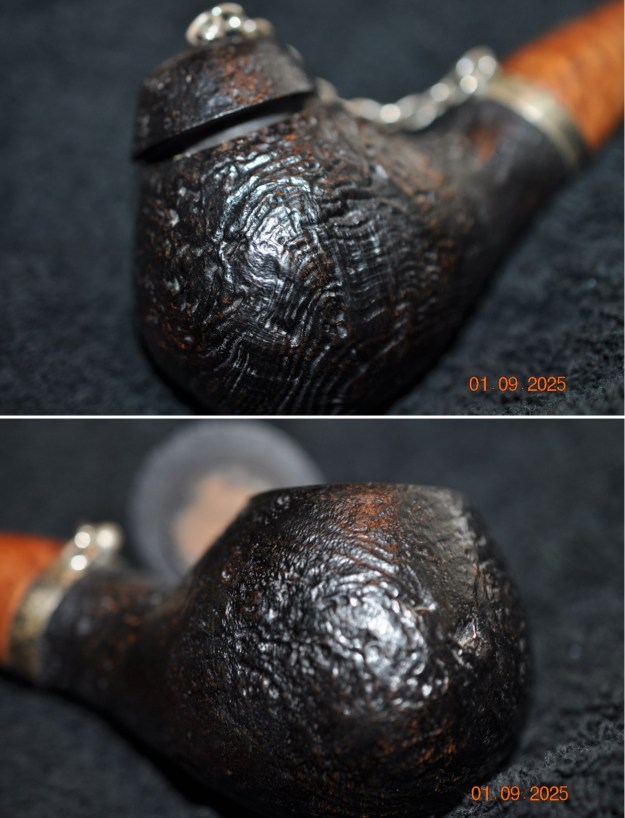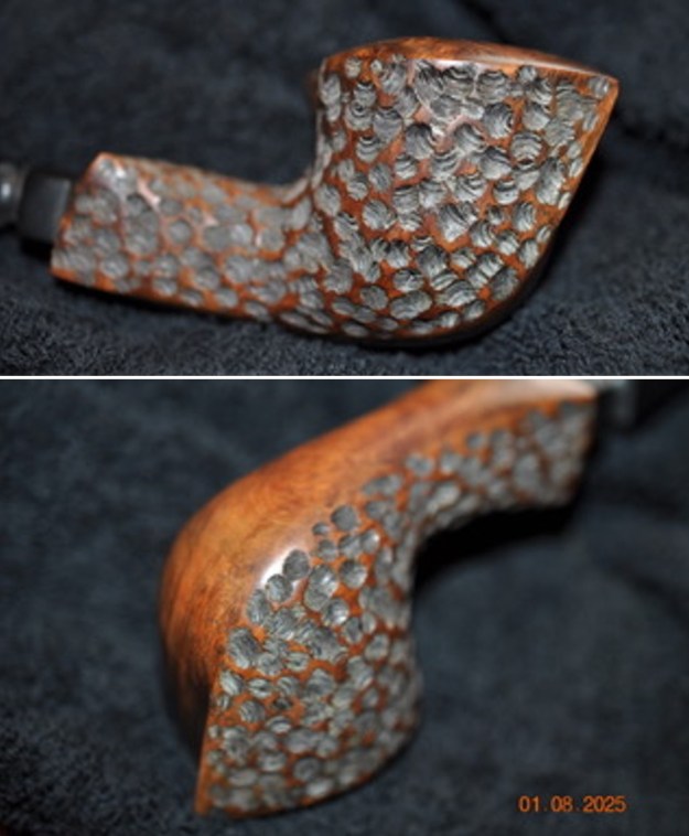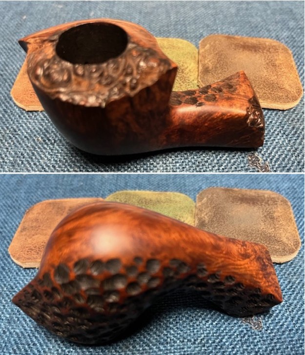 The next pipe I chose to work on was one that we purchased on 12/28/2024 from as part of an estate that belonged to a pipeman and carver, Byron Harwood from Missoula, Montana, USA. This uniquely shaped mixed finish Freehand was one of Byron’s own handmade pipes. As with the previous pipes of Byron’s that I have worked on, this one does not bear any stamping. It is a lovely piece of briar that cat’s eye shaped bowl with the rim top finished smooth on the right side and plateau on the left side to highlight the grain. There is a peak on the front and back of the bowl that gives it the unique eye shape. The finish on the bowl is smooth on the left side with a smattering of plateau on the shank end and hand rusticated on the right side with divots that bear rustication in each divot as well – you could say it was double rusticated, The airway in the mortise and shank are well executed and the draught is very good. The bowl had a moderate cake and there was some darkening and lava around the inner edge of the bowl and top. The saddle stem is rectangular shaped and quite nice. The button is well finished and the exit of the airway is slotted. The pipe fit well in the hand and was rustication was very tactile. There was a charm to it! Here is what it looked like when Jeff received it. He took some photos of the rim top and bowl from various angles to give me a clear picture of the shape of the bowl and rim and its condition. You can see the cake in the bowl and the darkening and light lava coat on the inner edge and rim top. He also took photos of the stem. It is dirty and has light tooth chatter on both sides ahead of the button. Jeff took some photos of the sides of the bowl to show the condition of the finish on the pipe. The photos shows the smooth finish on the left side of the bowl and shank, highlighting grain and the unique rustication on the right side. Under the dust it was a great Freehand. It is on pipes like this that I really appreciate Jeff’s thorough cleaning process. It gives me real freedom in dealing with pipes when they arrive here. He reamed it with a PipNet pipe reamer and got rid of the cake. He cleaned up the reaming with a Savinelli Fitsall Pipe Knife so that we could see the walls of the bowl and assess for damage. He cleaned the internals of the shank and stem with alcohol, pipe cleaners and alcohol. He scrubbed the exterior with undiluted Murphy’s Oil Soap and a tooth brush. He rinsed the pipe under warm water. He dried it off with a cloth and then let it air dry. The stem was scrubbed with undiluted Murphy’s Oil Soap and a tooth brush at the same time as the bowl. Once it was rinsed off, it came out looking very good. The finish on the bowl and the rim top cleaned up nicely. I took pictures of the pipe to show how it looked when I unpacked it. I took close-up photos of the bowl and rim top to show the condition after cleaning. It looked great. I also took photos of the stem surface to show the light chatter ahead of the button on both sides. I to a photo of the pipe with the stem removed to give a sense of size and perspective. I polished the smooth side of the bowl and shank as well as the smooth half of the rim top with micromesh sanding pads – dry sanding with 1500-12000 grit pads and wiping it down after each sanding pad with a damp cloth. I worked some Before & After Restoration Balm into the surface of the smooth briar with my finger tips and the plateau and rustication with a shoe brush. I let it sit on the bowl for 10 minutes and then buffed it off with a paper towel and soft cloth. The product is a great addition to the restoration work. It enlivens, enriches and protects the wood while giving it a deep glow. It is a product I use on every pipe I restore. I sanded the stem with 320-3500 grit 2×2 inch sanding pads. I wiped the briar down after each pad with a damp cloth to remove the sanding dust and debris. I wiped it down with an Obsidian Oil cloth. It began to look very good.I polished it with micromesh sanding pads – dry sanding with 1500-12000 grit sanding pads. I wiped it down after each sanding pad with Obsidian Oil. I polished it with Before & After Pipe Stem Polish – both Fine and Extra Fine. I buffed the stem with a soft cloth to raise the shine. I gave it a final wipe down with Obsidian Oil to protect it. I don’t know what it is about finishing a restoration but I have to tell you that it is my favourite part of the process. It is the moment when everything that I have worked on comes together. I can compare it to where I started and there is always satisfaction that it looks better than when we picked it up. As always, I put this Byron Harwood Mixed Finish Freehand back together and buffed it with Blue Diamond on the buffing wheel. I gave the bowl and the stem multiple coats of carnauba wax. I buffed the pipe with a clean buffing pad and hand buffed it to raise the shine. It is fun to see what the polished bowl looks like along with the polished the vulcanite saddle stem. This Byron Harwood Freehand is a great looking pipe and I am sure that it will be comfortable in hand when smoking as it is light and well balanced for a pipe of this size. Have a look at it with the photos below. The dimensions are Length: 7 inches, Height: 1 ¾ inches without the cap and 2 inches with the cap, Outside diameter of the bowl: 1 ¾ inches wide x 2 ¼ inches long, Chamber diameter: 7/8 of an inch. The weight of the pipe is 2.29 ounces/65 grams. It is another beautiful pipe and one that will be on the rebornpipes store soon. You can find it in the section of Pipes by American Pipe Makers. If you are interested in adding it to your collection let me know. Thanks for walking through the restoration with me as I worked over this pipe. Thanks to each of you who are reading this blog.