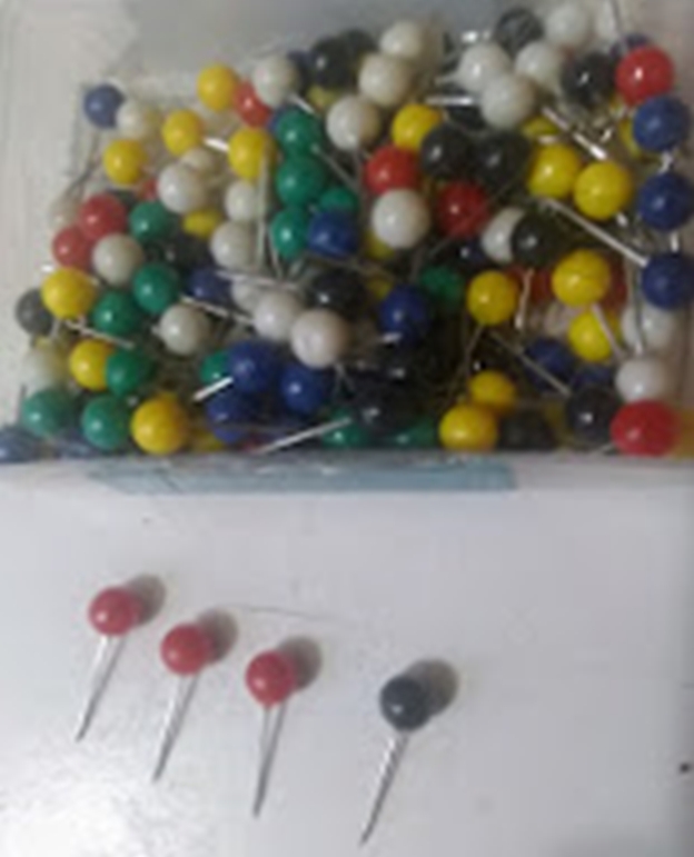 Faced with the not altogether unanticipated contingency of somehow having to replace a bulb or two, as I still considered them, I had already considered using small push pins, the kind for wall maps, and had found a couple of places online that carried close to the same shade of brown in case it became necessary. Hoping to avoid the time waiting for them to arrive by mail, however, I scoured this wannabe big city that is lacking in so many of the amenities found in the real thing. The best I could find was the following box of 200 map pins in every color but brown (any shade of it!). The good news was that they only cost $2.99 minus tax at a hobby store. I concluded it would be necessary to replace all seven of the bulbs for the sake of consistency and suppose I might have opted for a conservative dark blue or even black, but as Tom Cruise’s high school character in Risky Business put it, “Sometimes you just have to say what the @#$*!” Besides, Christmas is coming up. The smaller brown pin below was an original I twisted out.