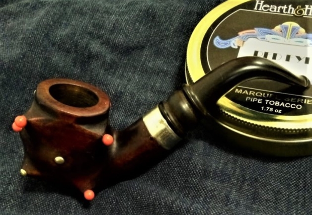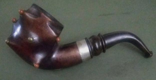 fore I continue, take a close look at the bowl and count the bulbs and brass studs. There are seven bulbs and four studs, and the arrangement may seem random. But look again, and you’ll see a very odd order: on the left side, the bulbs start on the top left to right and then down to the bottom right; the studs move diagonally from the lower left to the middle. On the right side, the opposite is true: the bulbs go from top left down to bottom left and then bottom right, and the studs are diagonal from top right to middle. On the front, three bulbs form a diagonal, tic-tac-toe line from top right to bottom left, or vice versa if you prefer. Finally, the back shows all four corners with bulbs. The person who crafted this pipe had a very playful sense of order.