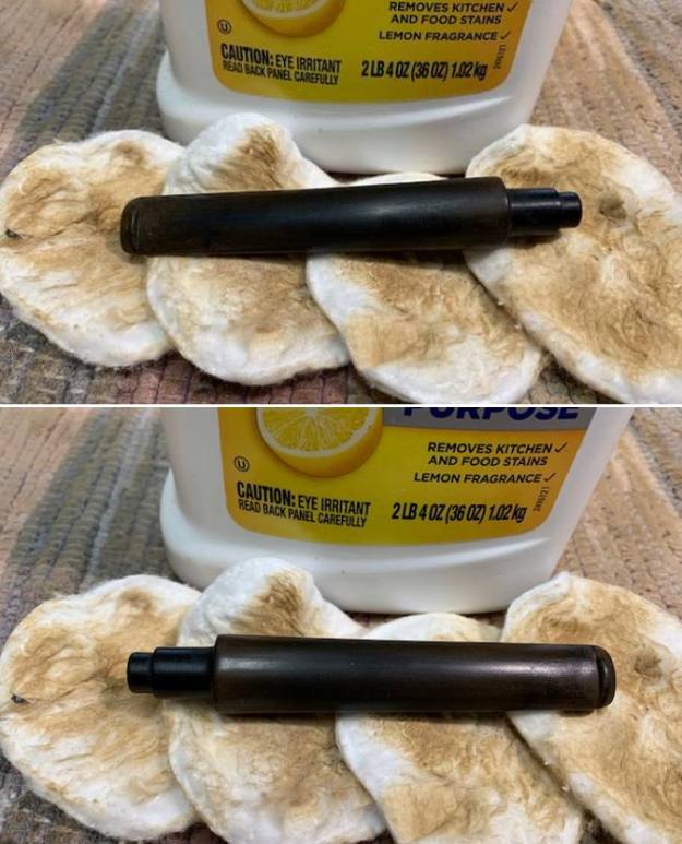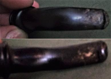 A few close-ups show the peculiarities and problems I found. The first, featuring the front of the bowl, makes the little, round, plastic bulbs – which I did not yet know the means of connection to the bowl – appear red instead of their actual light brown. Scratches all over the uneven surface that is spotted with the bulbs and brass studs presented awkwardness to remove. The second shot, of the rim and chamber, has the correct color of the bulbs and at a glance seems the hardest part of the pipe’s repair but in fact was the easiest. The third pic made me happy the band was already spinning on the shank so I could leave it out of an early alcohol soak. The grime and stains would come off, but I knew I could not fill in the missing patches of nickel. Then there was the stem, top and bottom, with moderate tooth damage that would typically be no hassle to eliminate if it were Vulcanite.