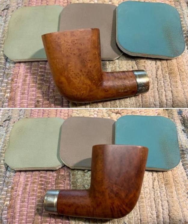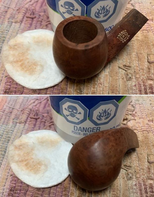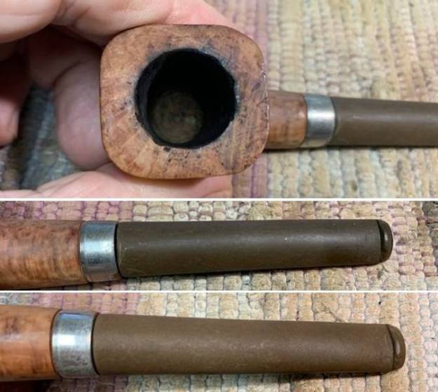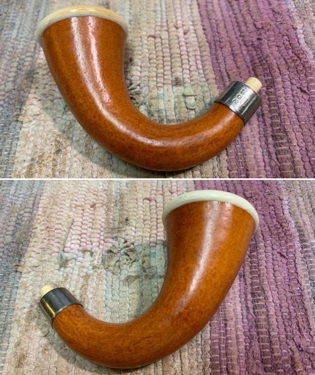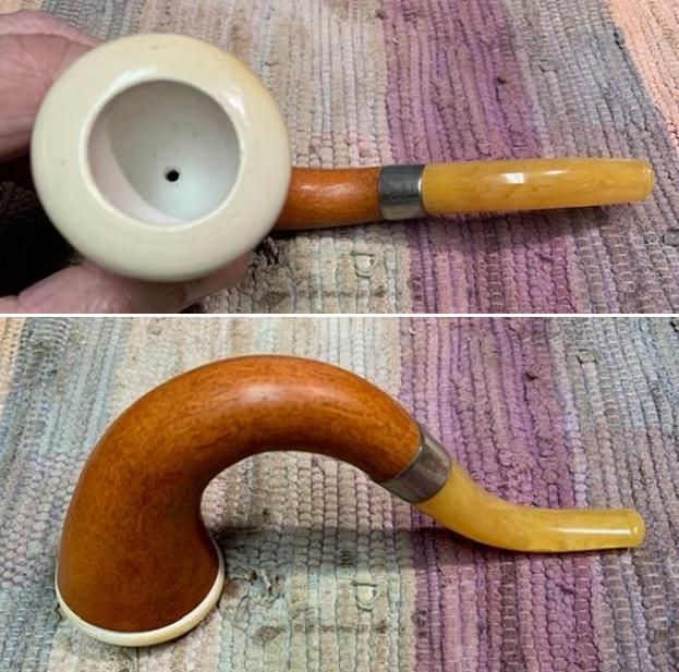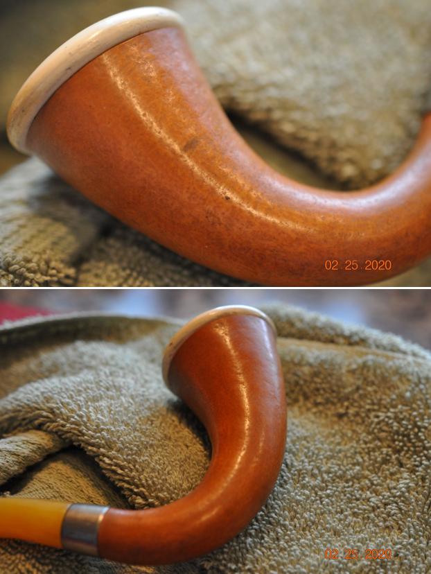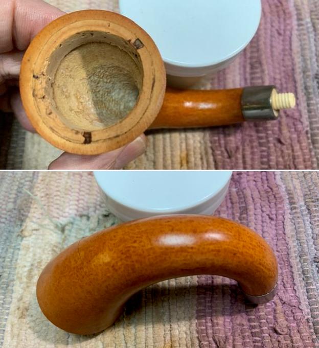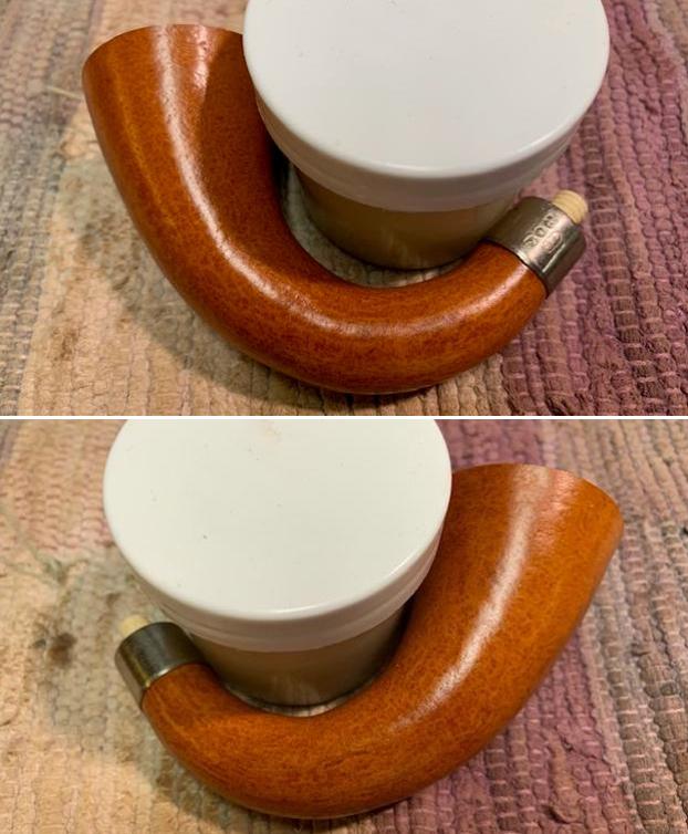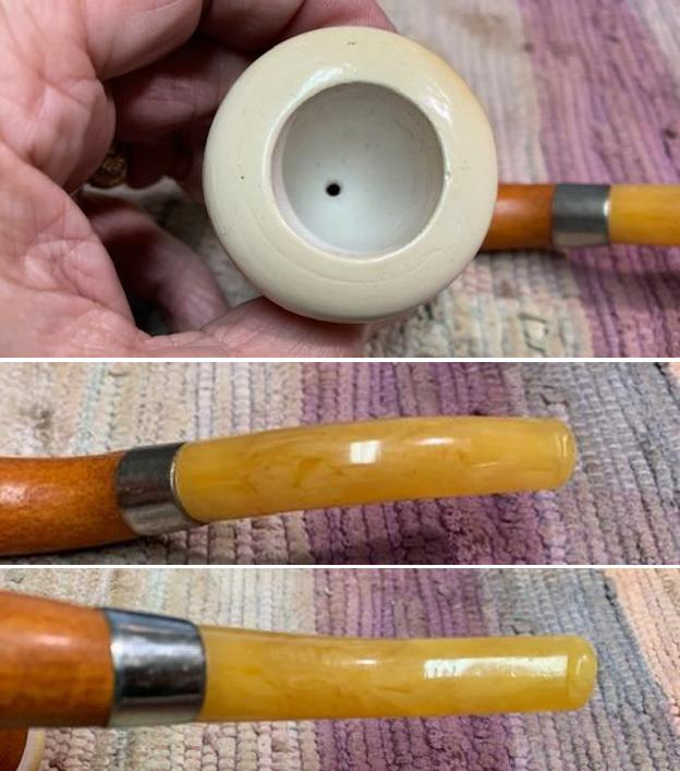 Needless to say, I was shocked when Steve not only replied that the Arcadia was real and “very old,” an age distinction he had never before made to me, but that he had worked on a meerschaum like it a couple of years ago. Here are some before and after shots of Steve’s meerschaum, which indeed bear a scary resemblance to my old briar.