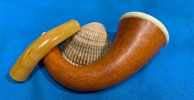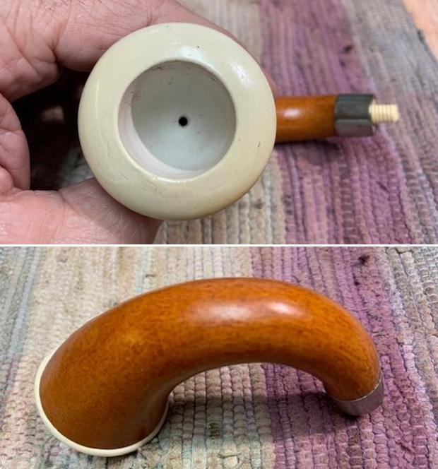 Now to address the stem issue. Similar to the rim cap, I went to my collection of stems and found an ideal replacement, based on Steve’s recommendation. I have several, very old, Bakelite stems that would be just right. The one I selected dates from the same time period as the pipe and, best of all, was unused – never smoked. The stem was marked Germany, the place of manufacture. I married the stem and stummel, and both Steve and I agreed that it looked perfect. I also had to hunt in my stores for an old bone tenon. This took a long time, but I finally found one that fit both the new stem’s mortise and the existing shank’s mortise. I quickly cleaned and polished up the stem (didn’t take long, as it was new) and put it aside.