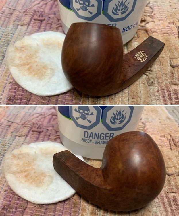 Thinking the Arcadia stem was Vulcanite but knowing it would do no harm anyway, I tossed it and the one from the Ben Wade reject candidate in an OxiClean bath. The usual old dirt and tobacco residue came off both. The first pictures after the bath show the stem not yet fully dried, and the next three dry.