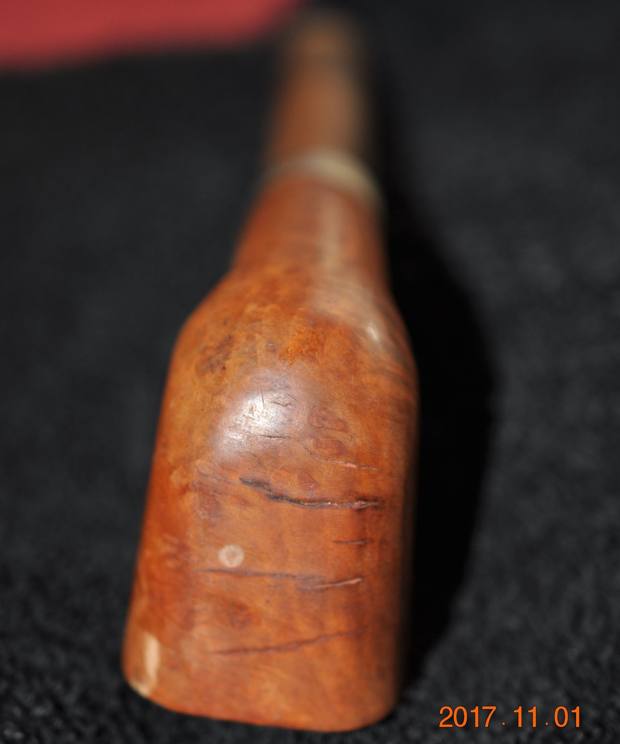 From the photos that I snapped when it arrived in the mail with the poker I believe is a Ben Wade reject, the only authentic-looking parts of a CPF are the band, bone tenon and stem. Otherwise, honestly, I could see where the basic chunk of wood could have been fashioned into a stummel long ago before some Flower Child got ahold of it and turned the bowl into a psychedelic pin cushion, but I could not imagine anyone alive more than a century ago, especially the Old World masters employed by CPF, fashioning such a monstrosity, as I saw the pipe before its comic beauty grew on me. I even used the “m” word in an email I sent to Steve, with a link to the eBay sale, in which I more or less implored him to tell me it wasn’t real, meaning a genuine CPF.