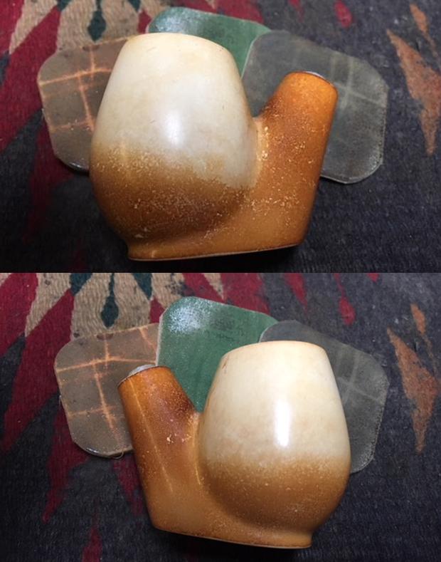 Jeff sent me this CAO Meerschaum Bent Sitter not too long ago. I am guessing it is from the 80s as it has that particular style of bent, thick Lucite stem. The shape is similar to the teacup shape that I have seen in briar pipes. Others might call it an egg shape. The finish is quite clean. The egg portion of the bowl is colouring toward the bottom of the bowl and the base. The base and the shank are more of a butterscotch colour. The rim top had some lava on the back edge of the bowl that had overflowed from the cake in the bowl. The stem is a swirled pearl colour varying from golds to creams colours. The button and slot itself were clean. There was some light tooth chatter on both sides of the stem near the button and there were light tooth marks as well. Jeff took some photos of the pipe from various angles before he started the cleanup.
