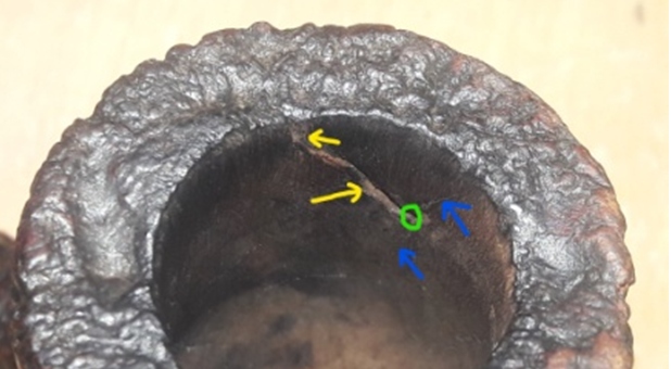 I took a closer look at the walls of the chamber to ascertain the condition of the chamber. To my chagrin, I noticed a distinct line (marked with yellow arrows) extending for about an inch from the inner rim edge in to the chamber. It was the beginning of a heat fissure and from the point of origin (circled in green), there were other two heat lines (marked with blue arrows) extending roughly perpendicular to the first. However, these heat lines were very minor and extremely superficial while the one that moved up towards the rim was slightly deeper. I checked the external stummel surface under bright light and magnification for any corresponding crack. It was heartening to note that there were none! I thoroughly checked the rim top surface and was relieved to note that there is no damage.