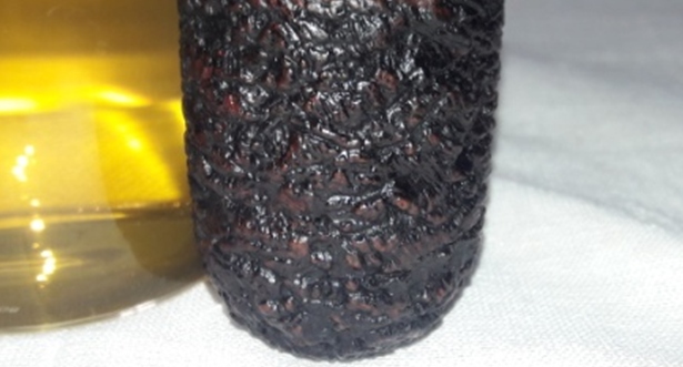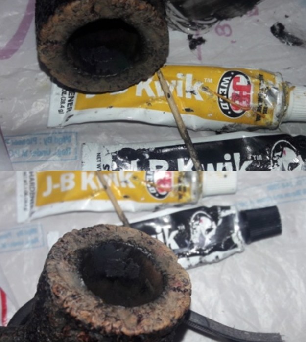 Before proceeding with further repairs, I thoroughly cleaned the rim top to completely remove the lava overflow from the rim top surface Murphy’s Oil soap and a brass wired brush. To protect the crack from coming in to direct contact with the burning tobacco and also to prevent the heat from reaching the external crack to the stummel and causing a burnout, I plan, firstly, to fill only the crack of the chamber with J B Weld followed by a second coat of activated charcoal and yogurt to the entire chamber which would assist in faster cake formation. J B Weld is a two-part epoxy Cold Weld that consists of two parts; hardener and steel which are mixed in equal parts in a ratio of 1:1 with hardening time of 5-6 minutes and complete curing time of 6-8 hours. I poured the contents of the two tubes and mixed it well. With a flat bamboo frond, I applied this mix and filled the intended crack. I worked fast to ensure a complete and even filling of the crack and set the stummel aside for the J B Weld to harden.